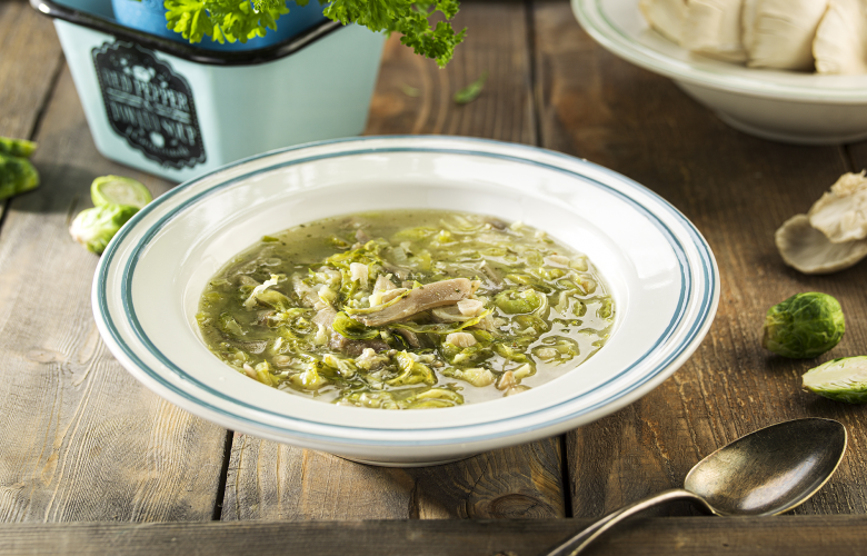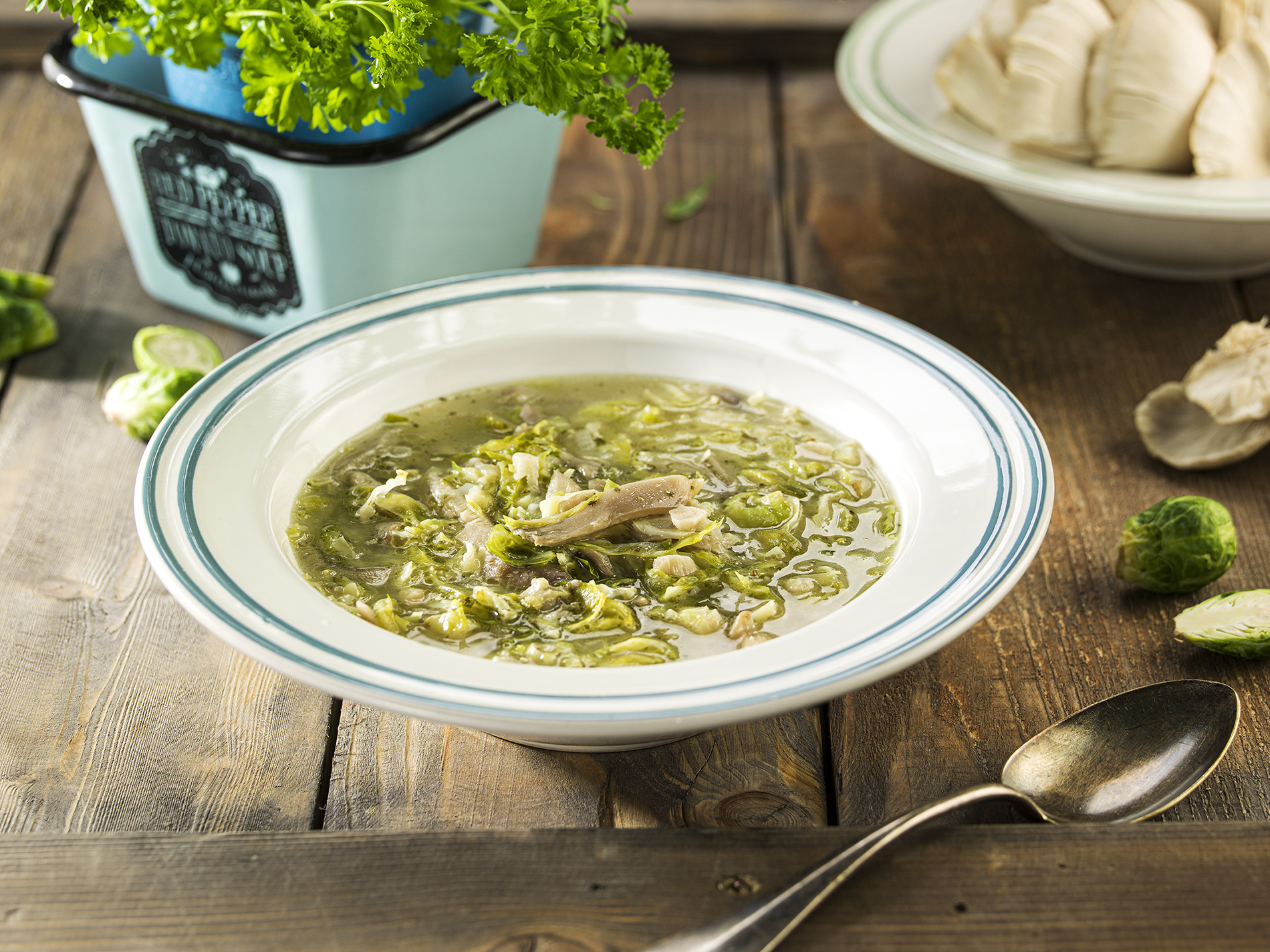 Kel zalejeme vodou, pridáme na plátky nakrájané čerstvé huby, dochutíme soľou, korením a drvenou rascou. Polievku varíme asi 30 minút.