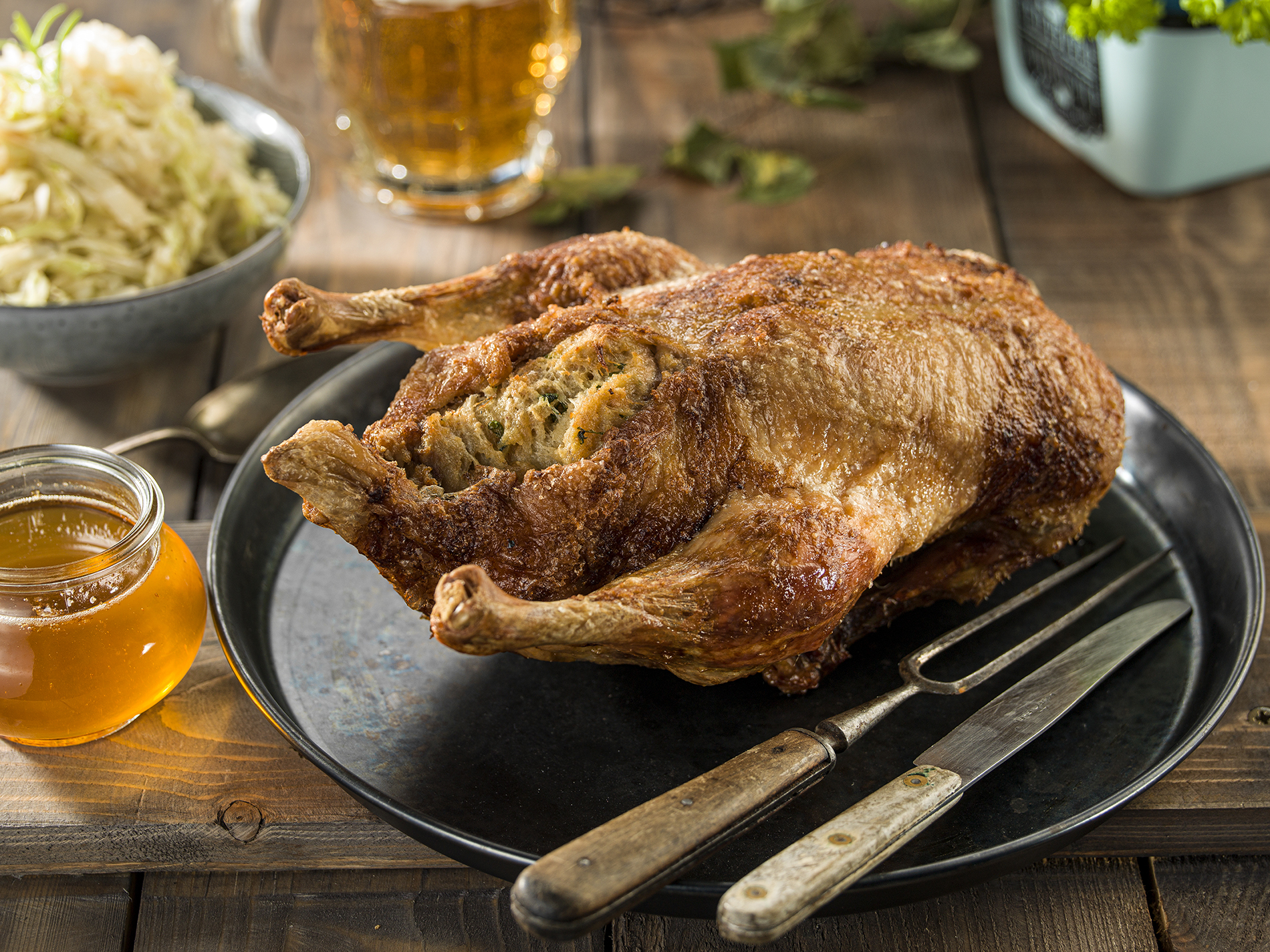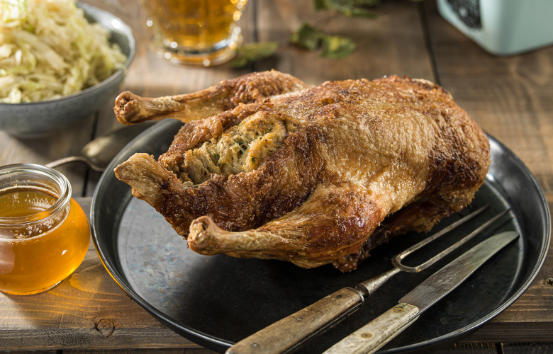 Zmesou naplníme očistenú kačicu. Otvor zafixujeme niťou alebo kuchynskými ihlami.