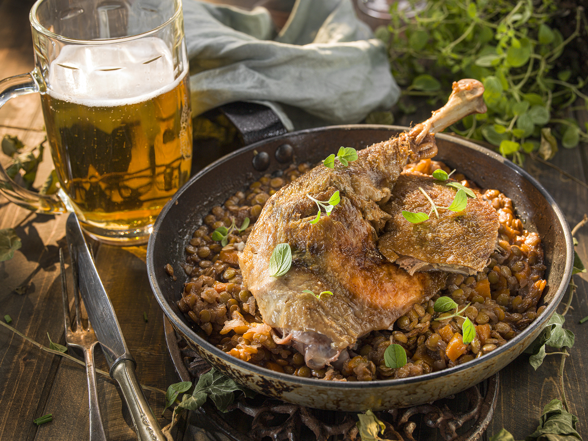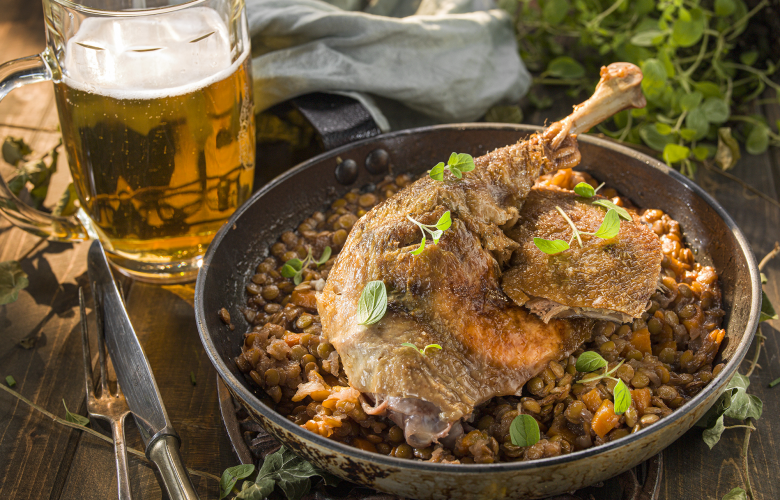Šošovicu najprv namočíme a potom uvaríme domäkka. Mrkvu a cibuľu očistíme, nakrájame nadrobno spolu s petržlenovou vňaťou. Víno, ocot a asi 250 ml vývaru z kačky zmiešame a zohrejeme.