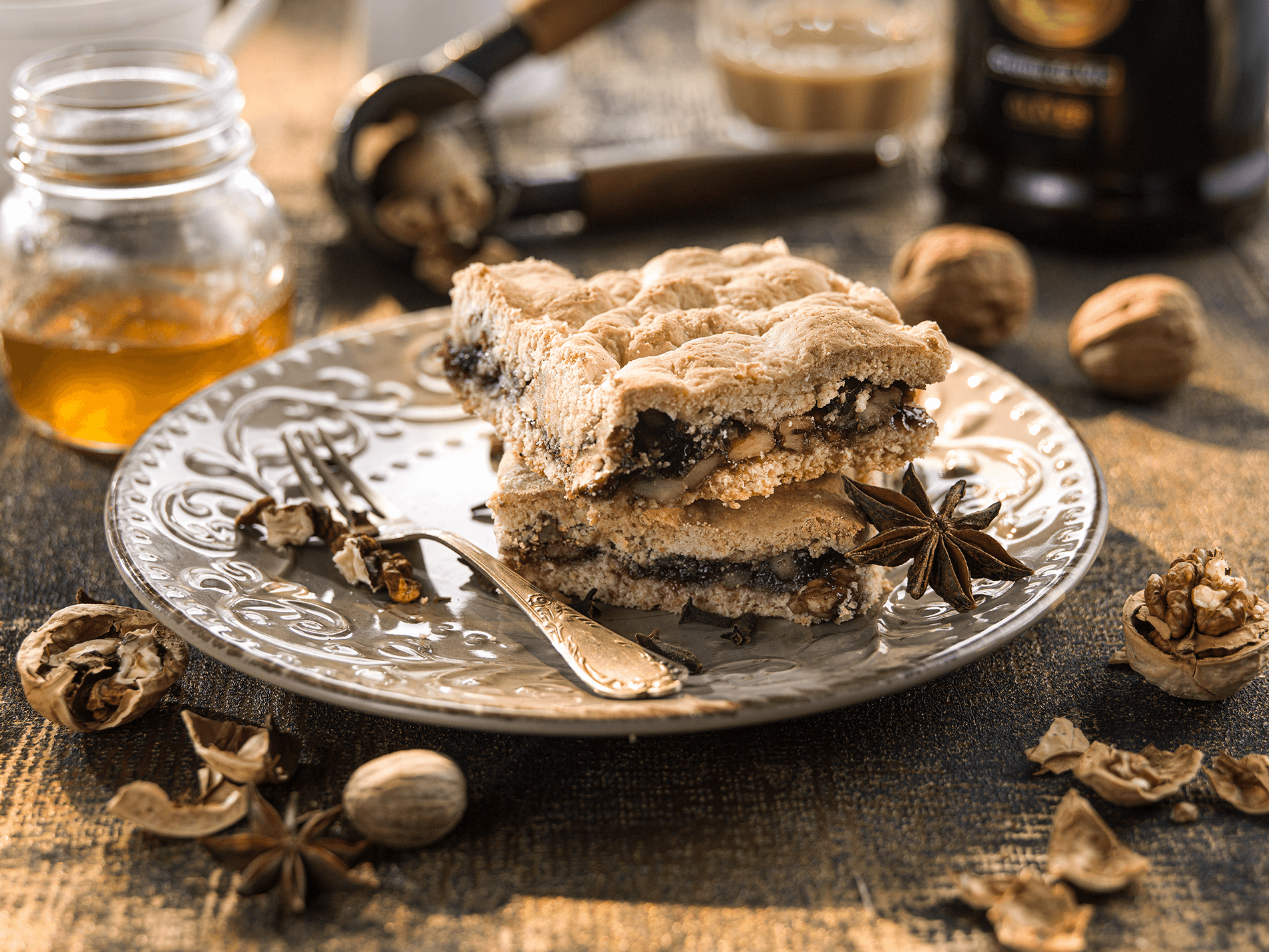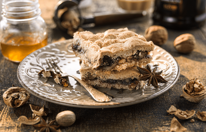 Na plnku zmiešame lekvár, orechy aj hrozienka a potrieme ňou cesto na plechu. Navrch dáme druhú polovicu rozvaľkaného cesta.