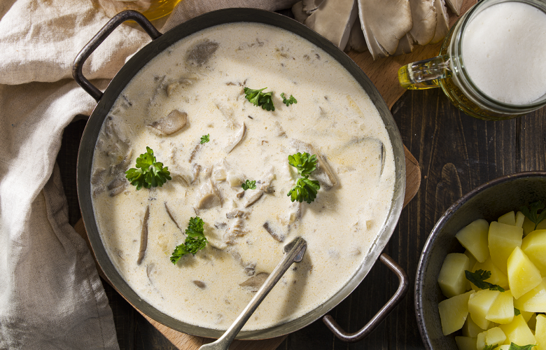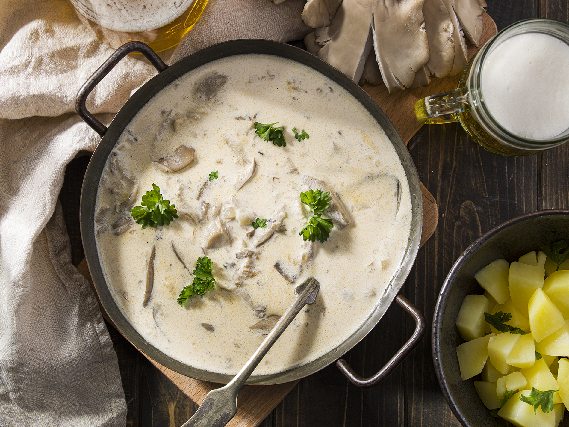 Opečenú hlivu podlejeme vodou a dusíme 20 minút. Potom pridáme smotanu na varenie a tiež kyslú smotanu zmiešanú s múkou. Na miernom ohni ešte niekoľko minút povaríme a ešte raz dochutíme.