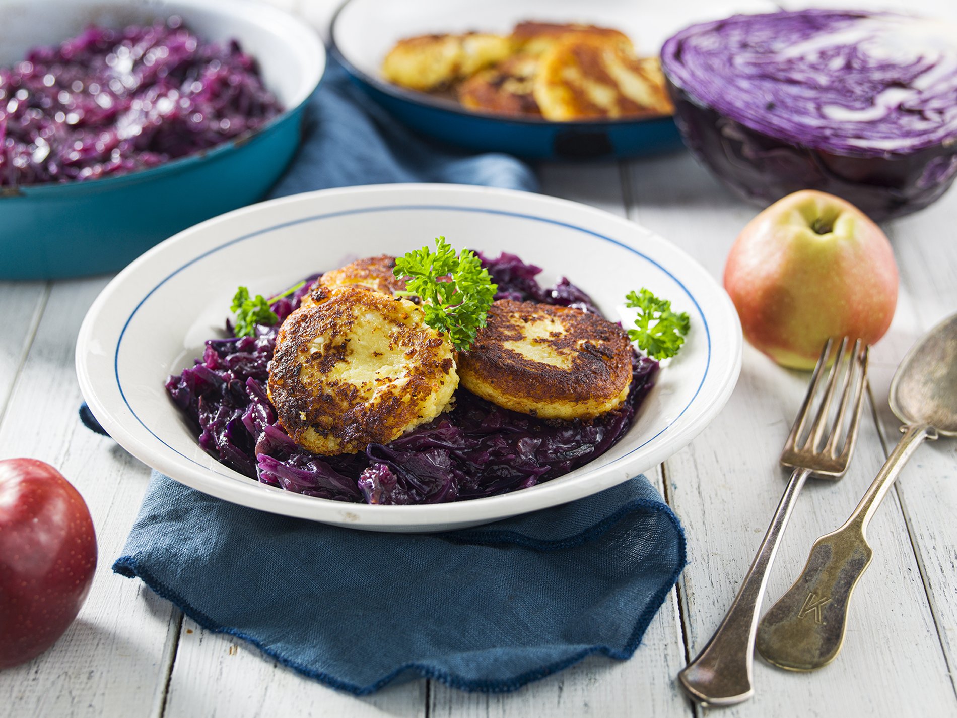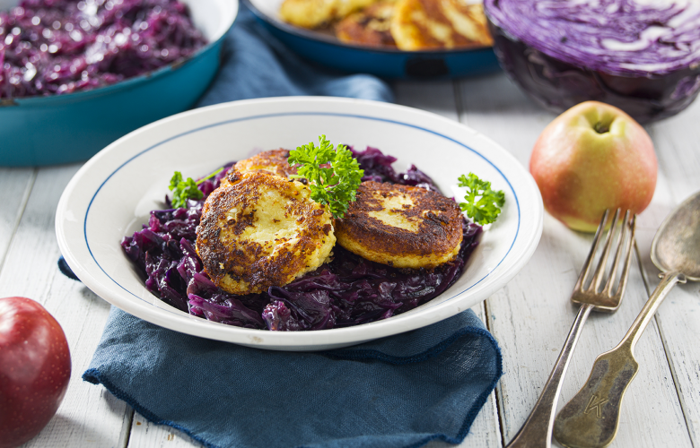 Zemiaky uvaríme v šupke, očistenú kapustu nakrájame na jemné rezance. Olúpané očistené jablká nastrúhame nahrubo. Olúpanú cibuľu prekrojíme a polovičky nakrájame na plátky.