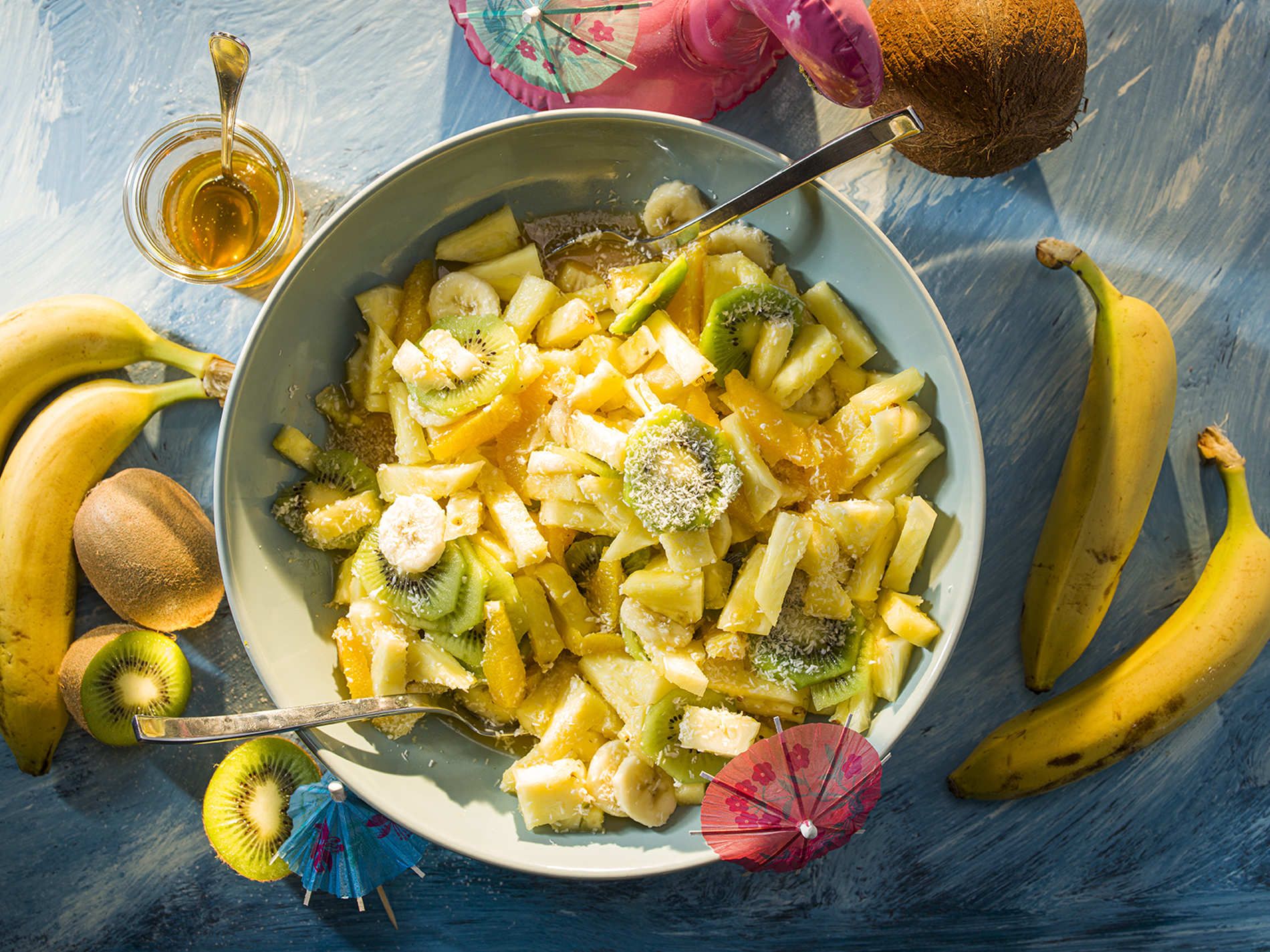 Olúpané banány nakrájame na plátky. Šalát premiešame, polejeme multivitamínovou šťavou, prelejeme medom a na záver posypeme kokosom.