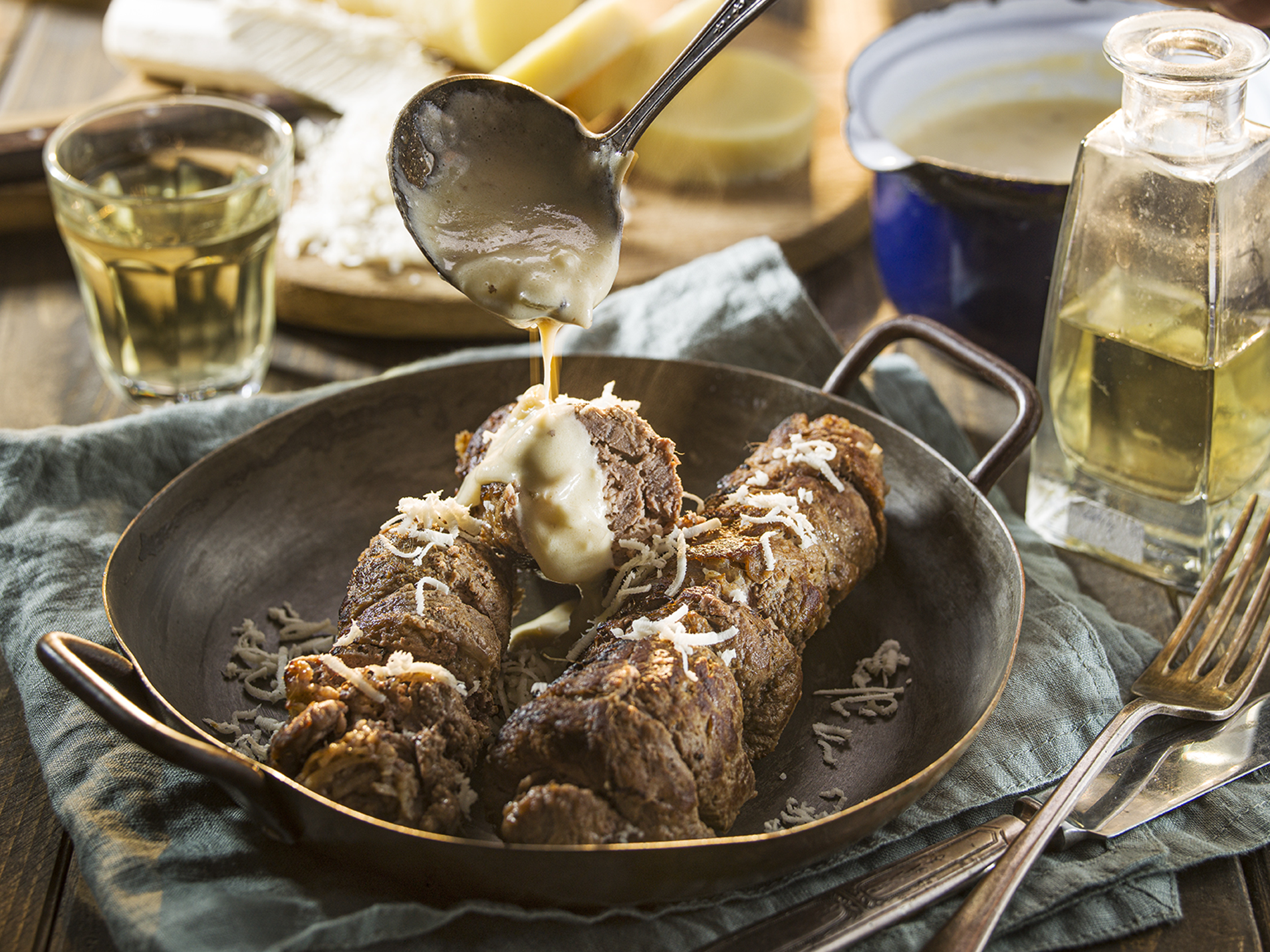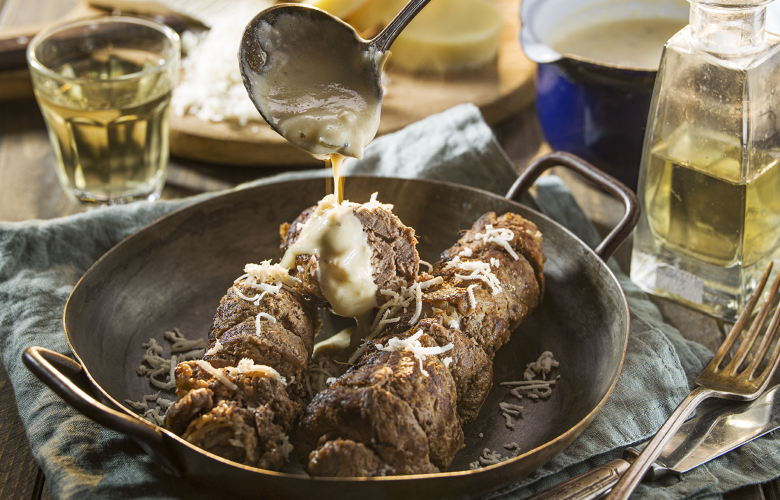 Mäso cez fóliu naklepeme na tenký plát, osolíme a potrieme 100 g masla vymiešaného s chrenom. Potom ho zvinieme do rolády a pevne zviažeme niťou, aby sa nerozpadlo.