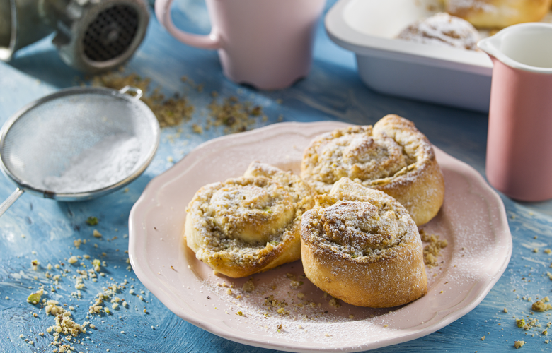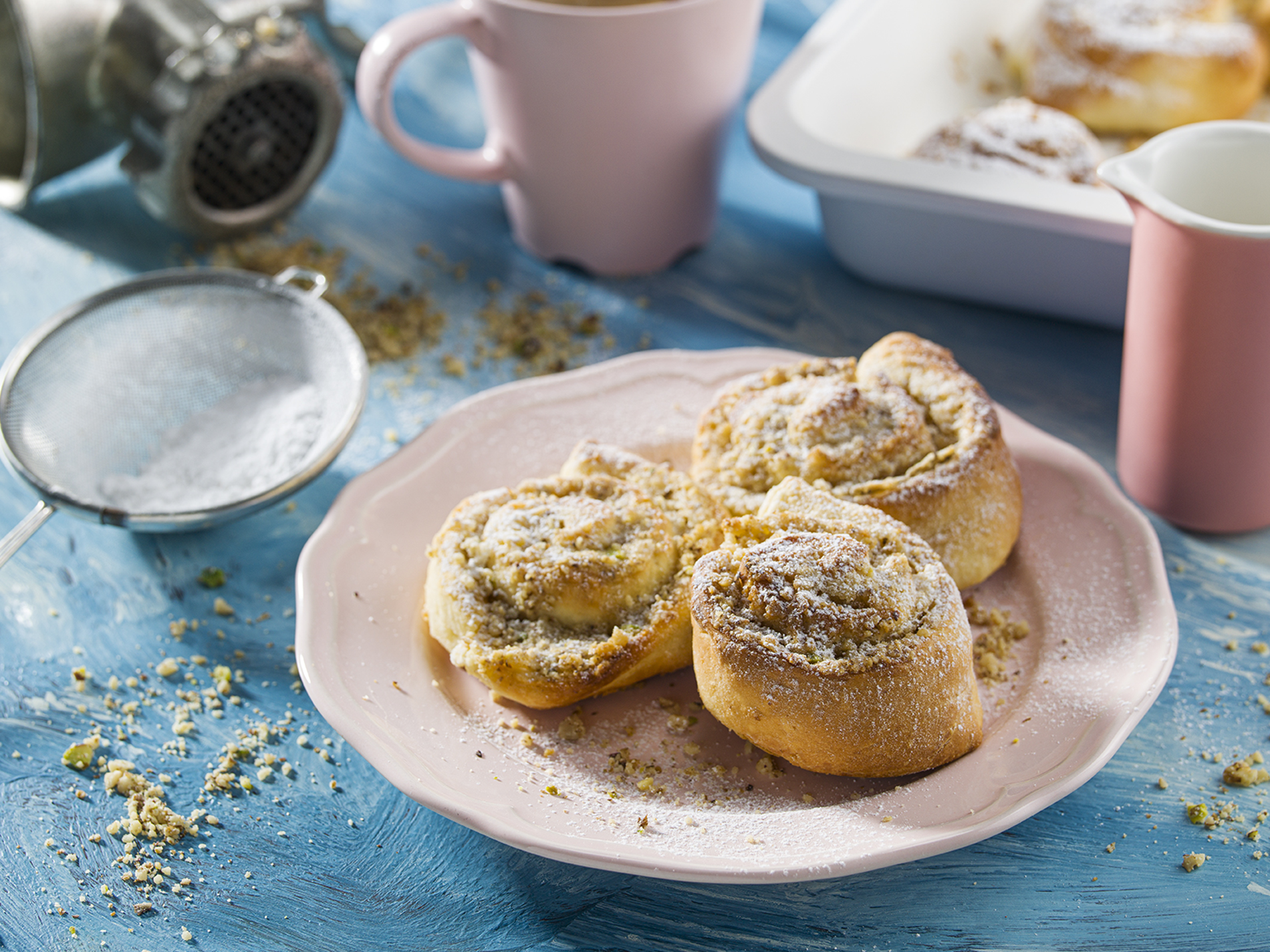 Hotové cesto rozvaľkáme, natrieme ho zmesou masla a práškového cukru, posypeme orechami a tiež vanilkovým cukrom. Cesto opatrne zvinieme a pripravenú roládu nakrájame na kolieska hrubé asi 1,5 cm.