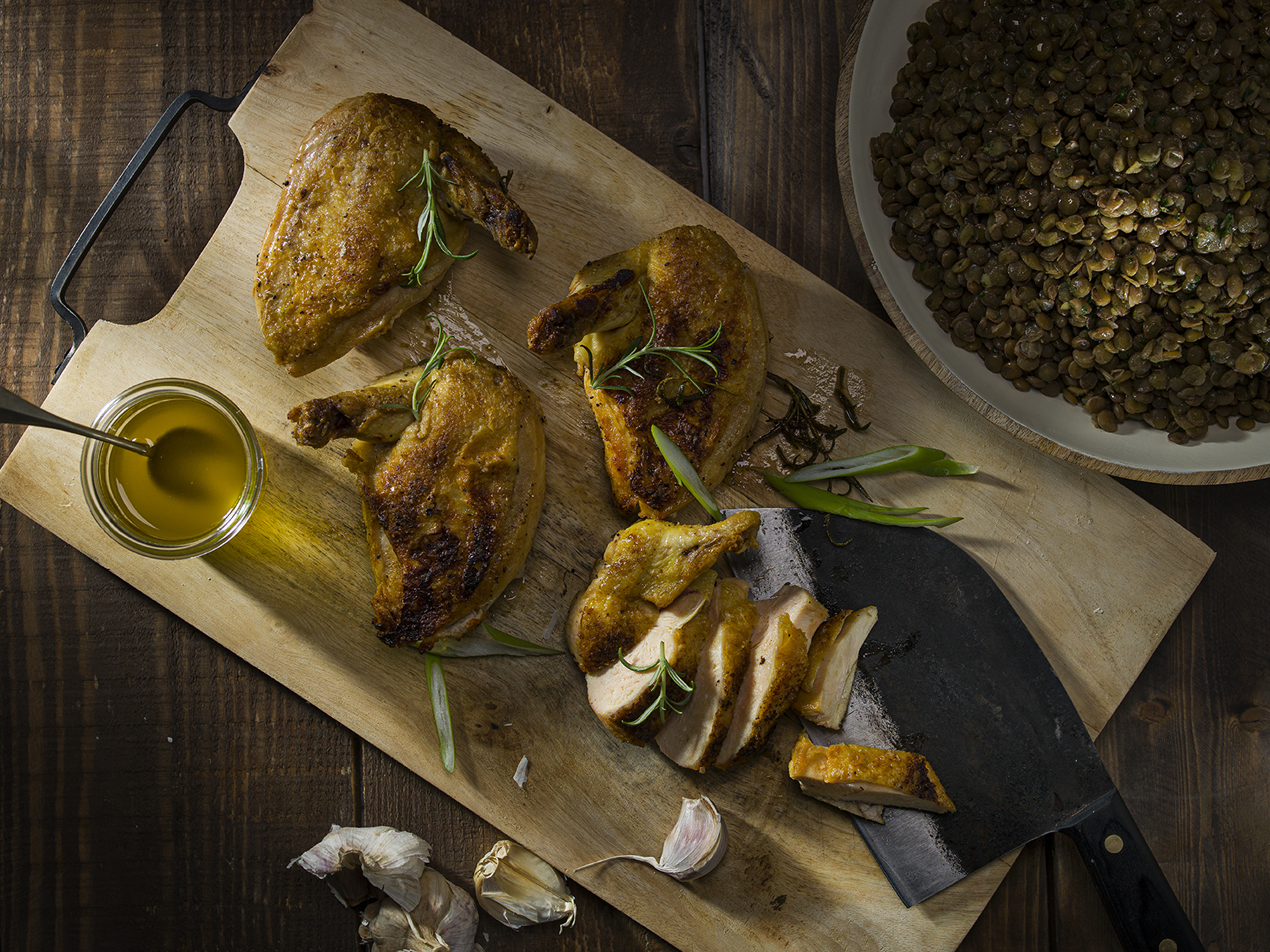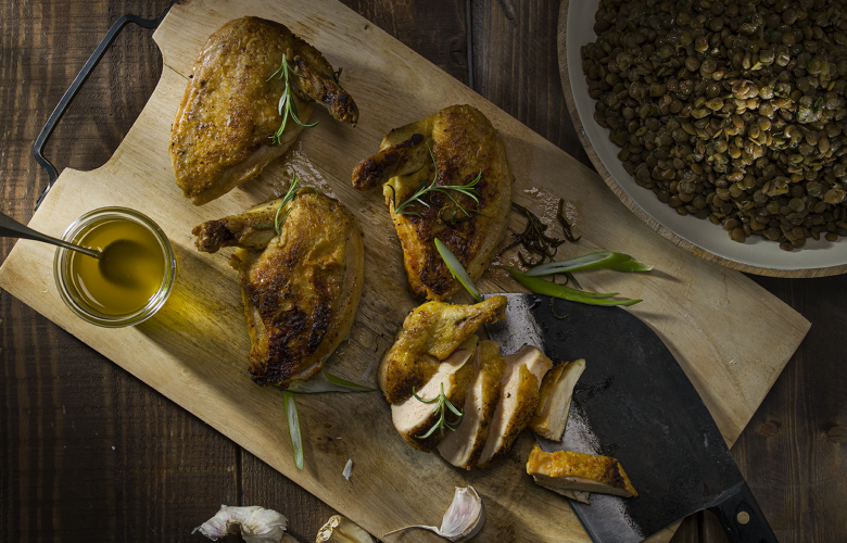Kuracie prsia potrieme olejom, osolíme, okoreníme a upečieme v rúre pri 200 °C dozlatista. Trvá to asi 20 až 30 minút. Potom ich nakrájame na tenké plátky a hneď podávame so šošovicou.