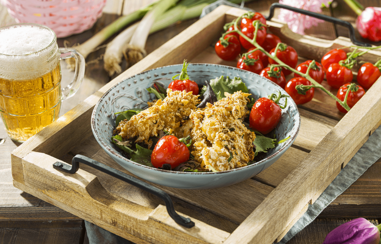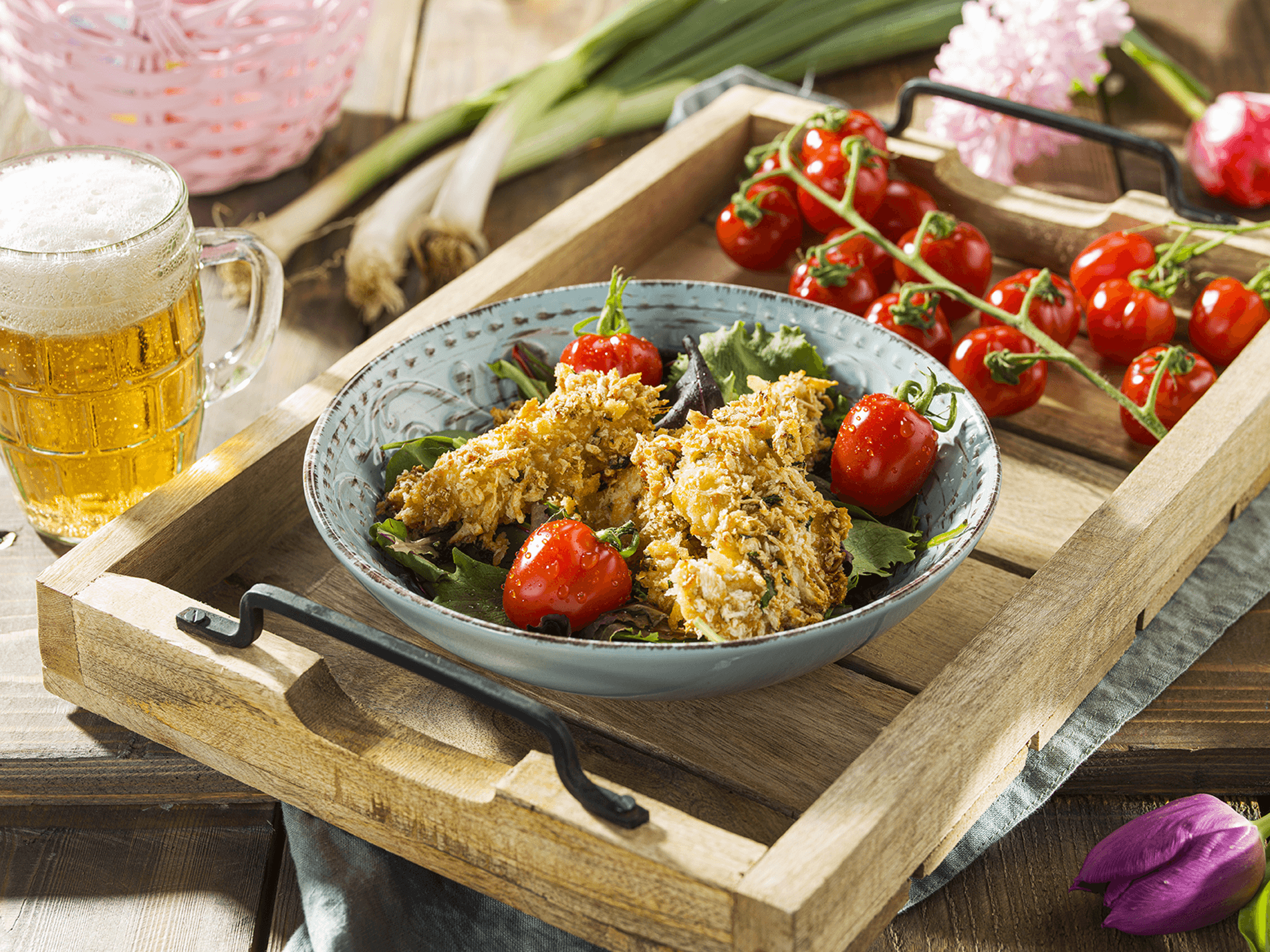 Strúhanku spojíme s nastrúhaným syrom a nadrobno nasekaným medvedím cesnakom. Kúsky mäsa namočené do jogurtu obalíme v strúhankovo-syrovej zmesi.