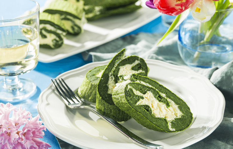 Z vychladnutého cesta stiahneme papier na pečenie, potrieme plnkou a zvinieme do rolády. Dáme stuhnúť do chladničky a potom krájame na plátky.