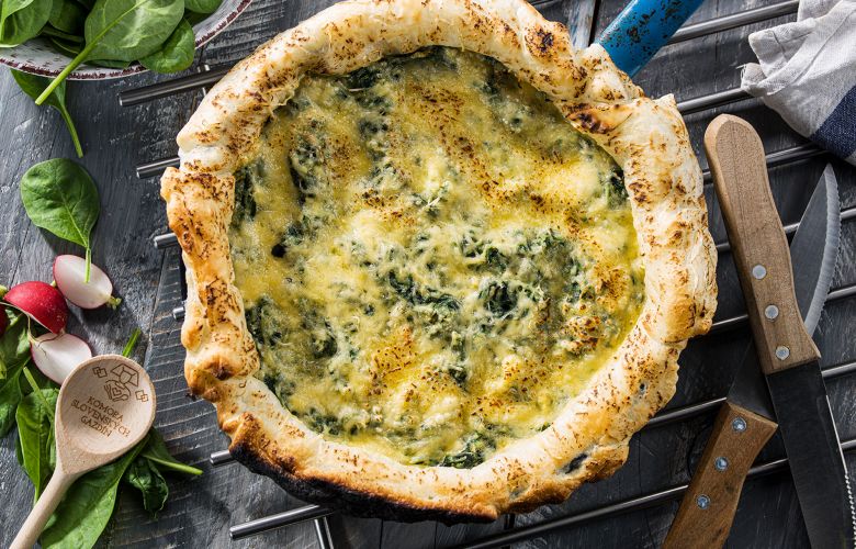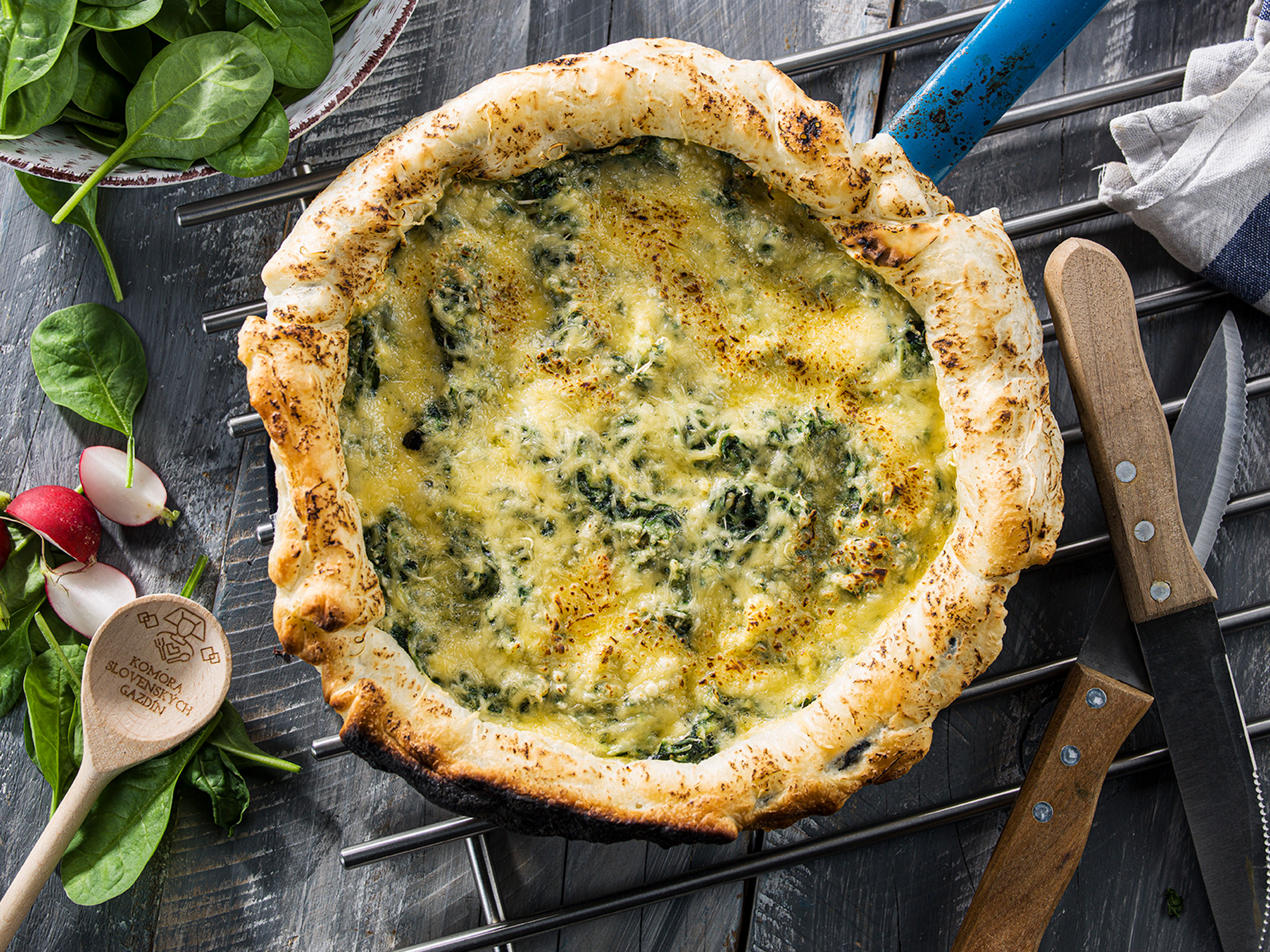 Cesto na pomúčenej doske vyvaľkáme na okrúhlu placku, dáme do koláčovej formy a vytiahneme aj po bokoch. Na cesto rozložíme špenátovú plnku, posypeme ju strúhaným syrom a pečieme vo vopred vyhriatej rúre na 220 °C asi 20 minút.