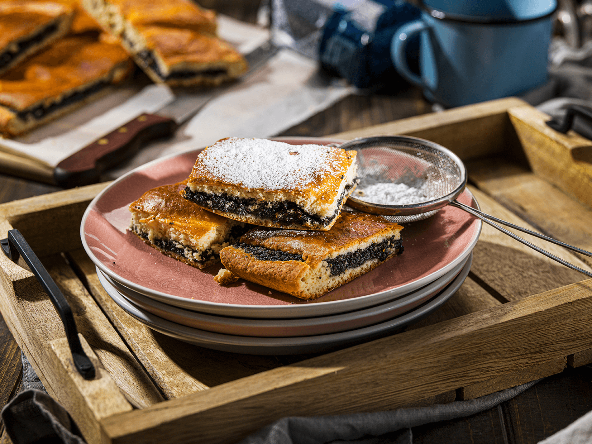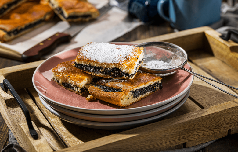 Z múky, cukru, masla, smotany, vajca, soli a prášku do pečiva vypracujeme cesto, ktoré necháme krátko postáť. Rozdelíme ho na polovice a každú vyvaľkáme na veľkosť plechu.