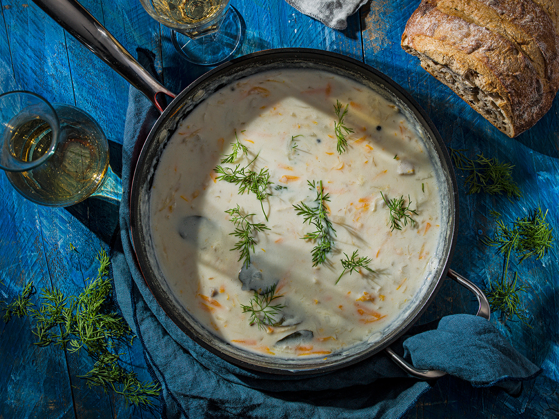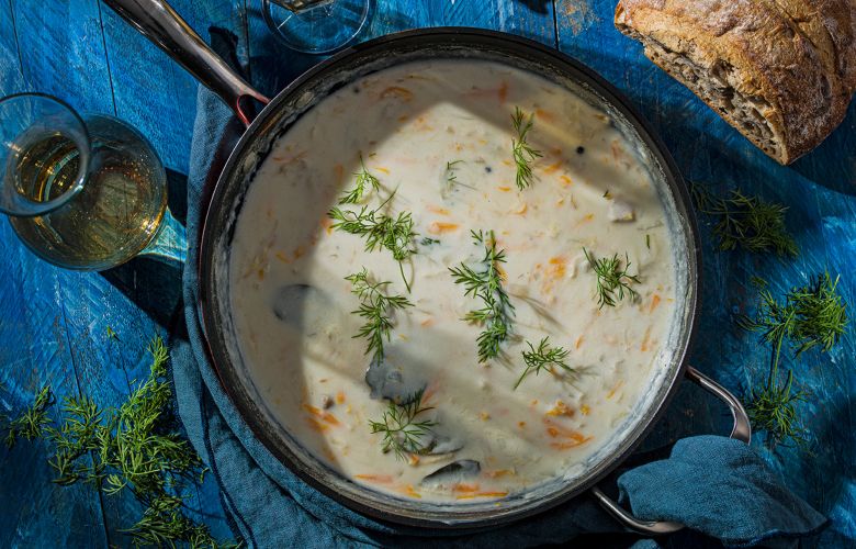 Z masla a múky pripravíme bledú zápražku, zalejeme ju rybím vývarom a ešte 5 minút povaríme. Zeleninu rozmixujeme a spolu s kúskami ryby pridáme do zahustenej šťavy.