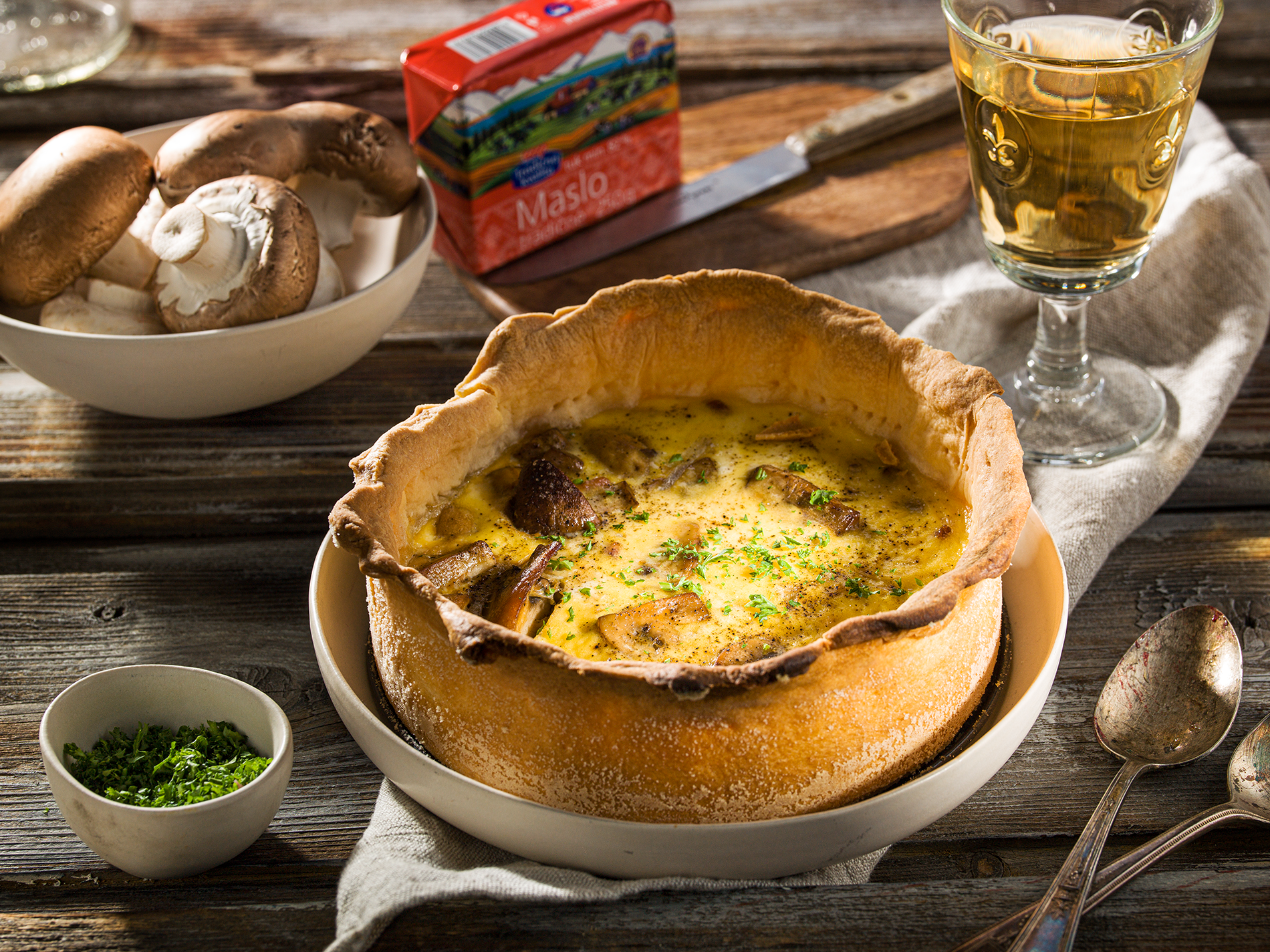 Huby očistíme a nakrájame. Rovnako očistíme aj pór, ktorý nakrájame na tenké kolieska. Vo veľkej panvici rozohrejeme olej, opečieme nakrájanú slaninu, ktorú potom vyberieme. Na vypečenom tuku opečieme nakrájané huby a opekáme, kým sa neodparí tekutina z húb. Potom krátko opečieme s hubami aj nakrájaný pór. Ochutíme soľou, korením a prisypeme kocky slaniny.