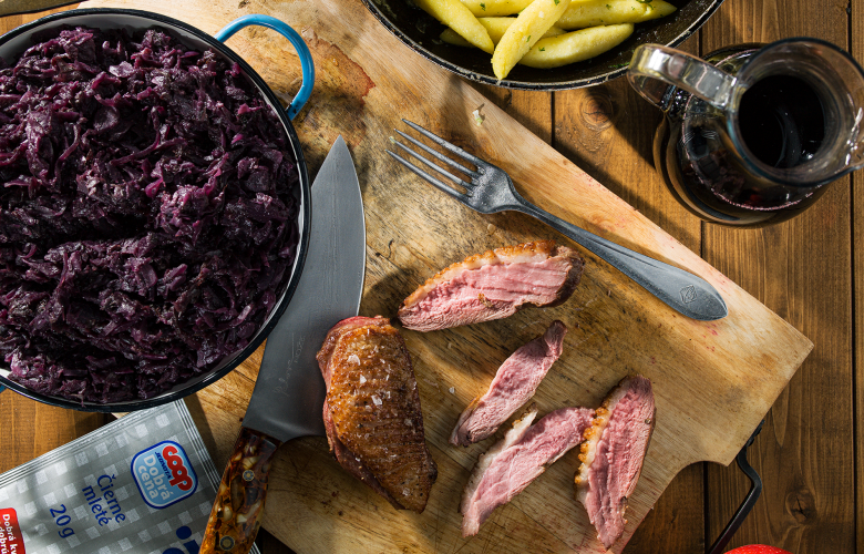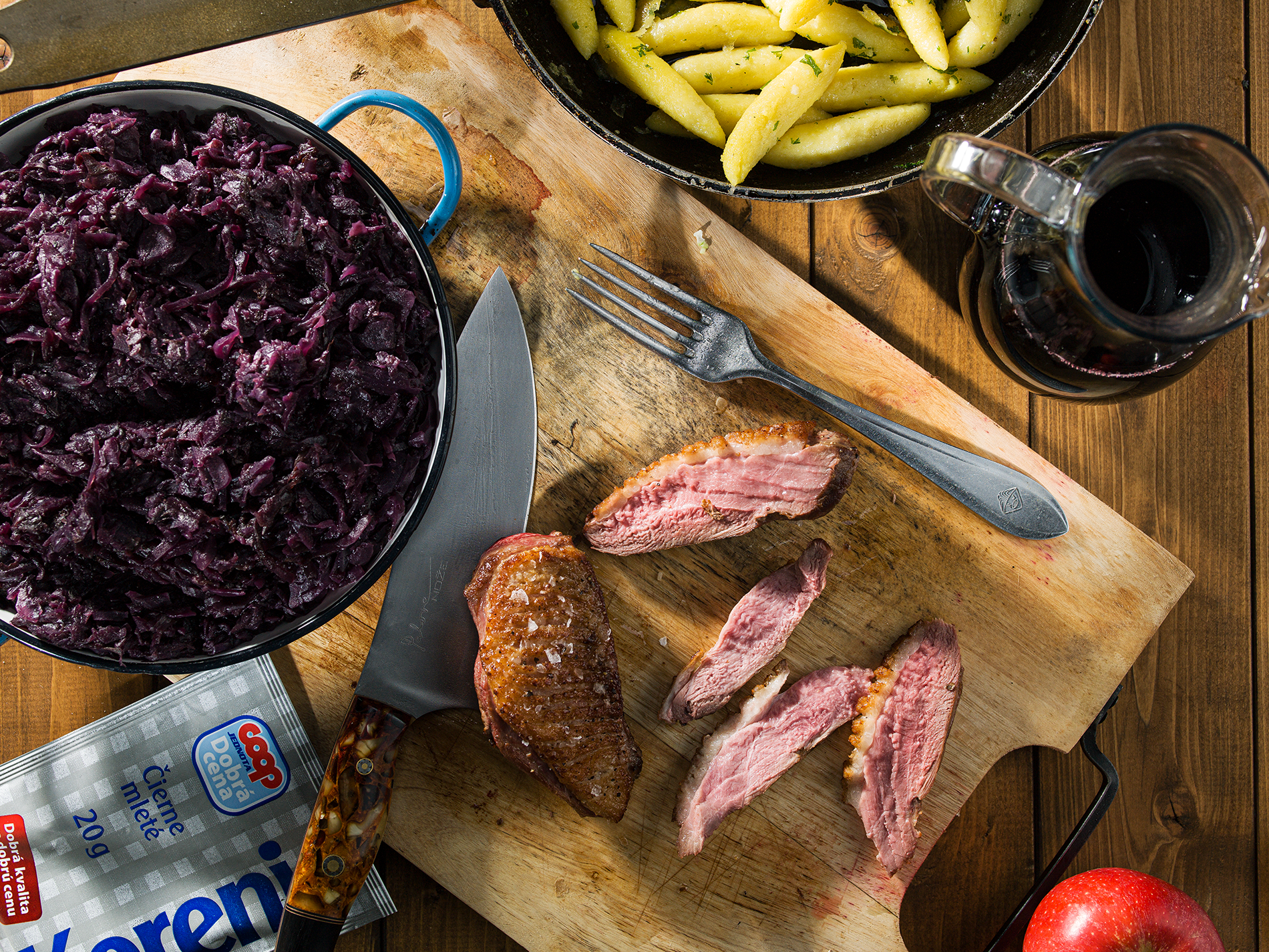 Na taniere servírujeme nakrájané kačacie prsia s porciou udusenej kapusty a opečenými šúľancami.
