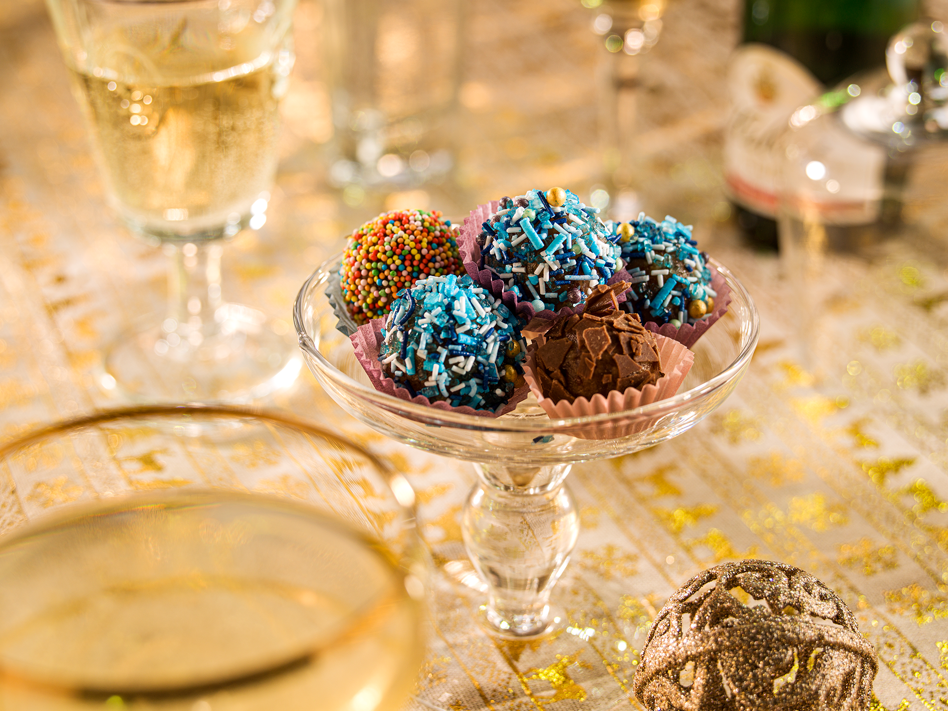 Z pripravenej zmesi sformujeme 20 rovnako veľkých guľôčok a tie obalíme v čokoládovej ryži. Guľôčky poukladáme do malých papierových košíčkov a dáme až do podávania do chladu.