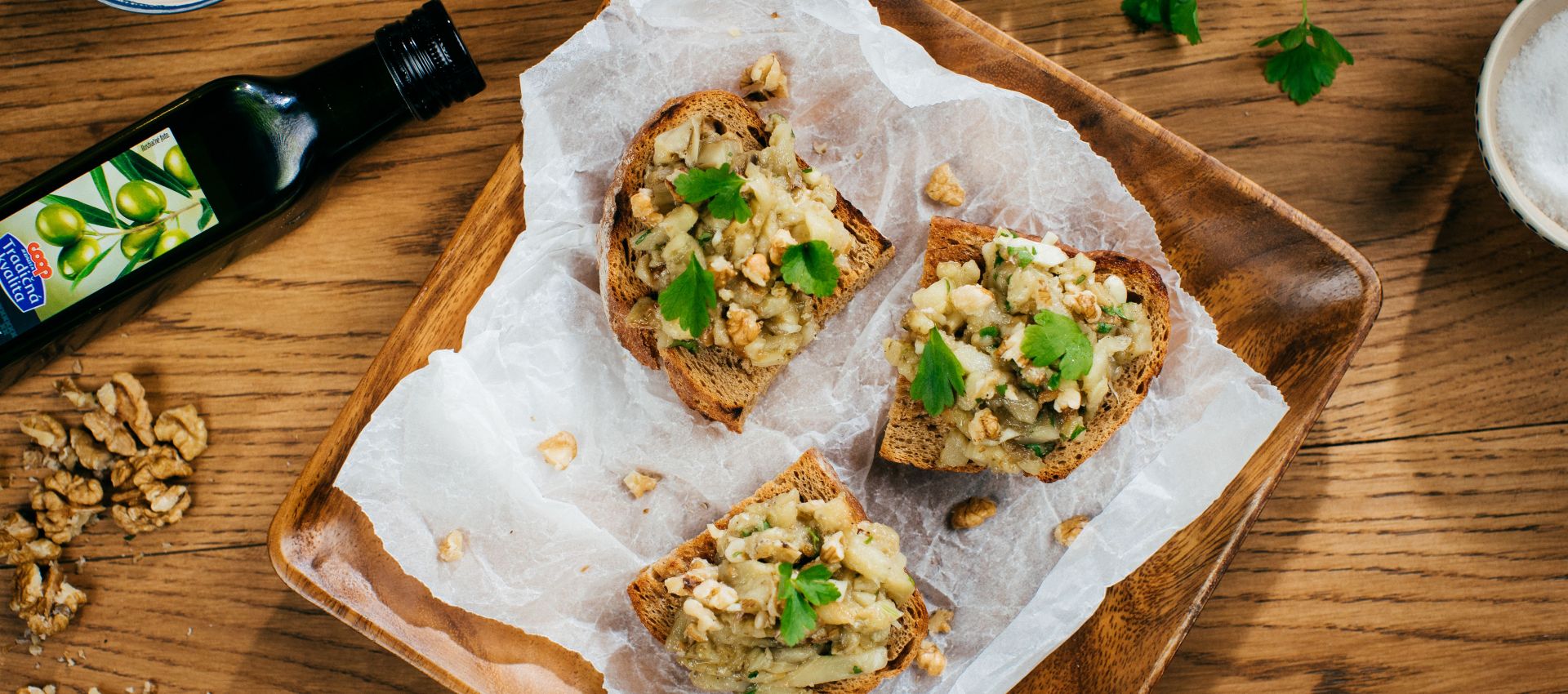 Vychladnuté baklažány vydlabeme lyžicou a nasekáme na jemno, pridáme olivový olej, nasekaný cesnak na jemno, petržlenovú vňať a orechy. Zamiešame a dochutíme soľou a čiernym korením.