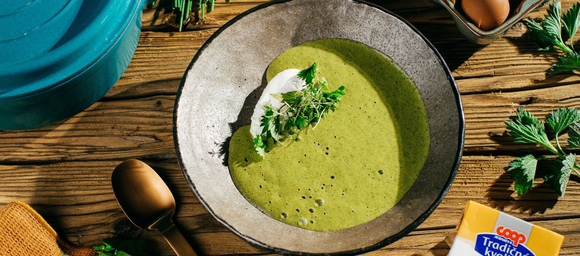 Vo väčšej nádobe rozohrejeme maslo. Bylinky umyjeme, najemno nasekáme a krátko speníme na masle (časť si odložíme na ozdobenie). Pridáme múku a za stáleho miešania pripravíme bielu zápražku. Zápražku zriedime vývarom a niekoľko minút povaríme.