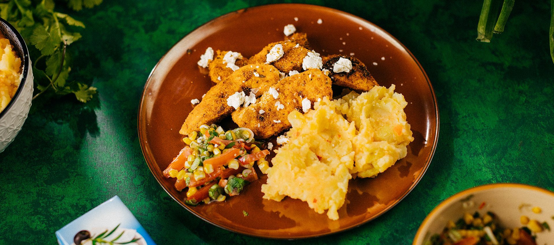Kuracie prsia naklepeme a okoreníme zmesou korenia (soľ, sladká paprika, oregano, cesnak, chili a polenta). Kura následne opečieme na olivovom oleji z každej strany dozlatova (3 minúty z každej strany). Na očistenej panvici opečieme slaninu a k nej pridáme fazuľové lusky. Jedlo na tanieri dozdobíme syrom feta.