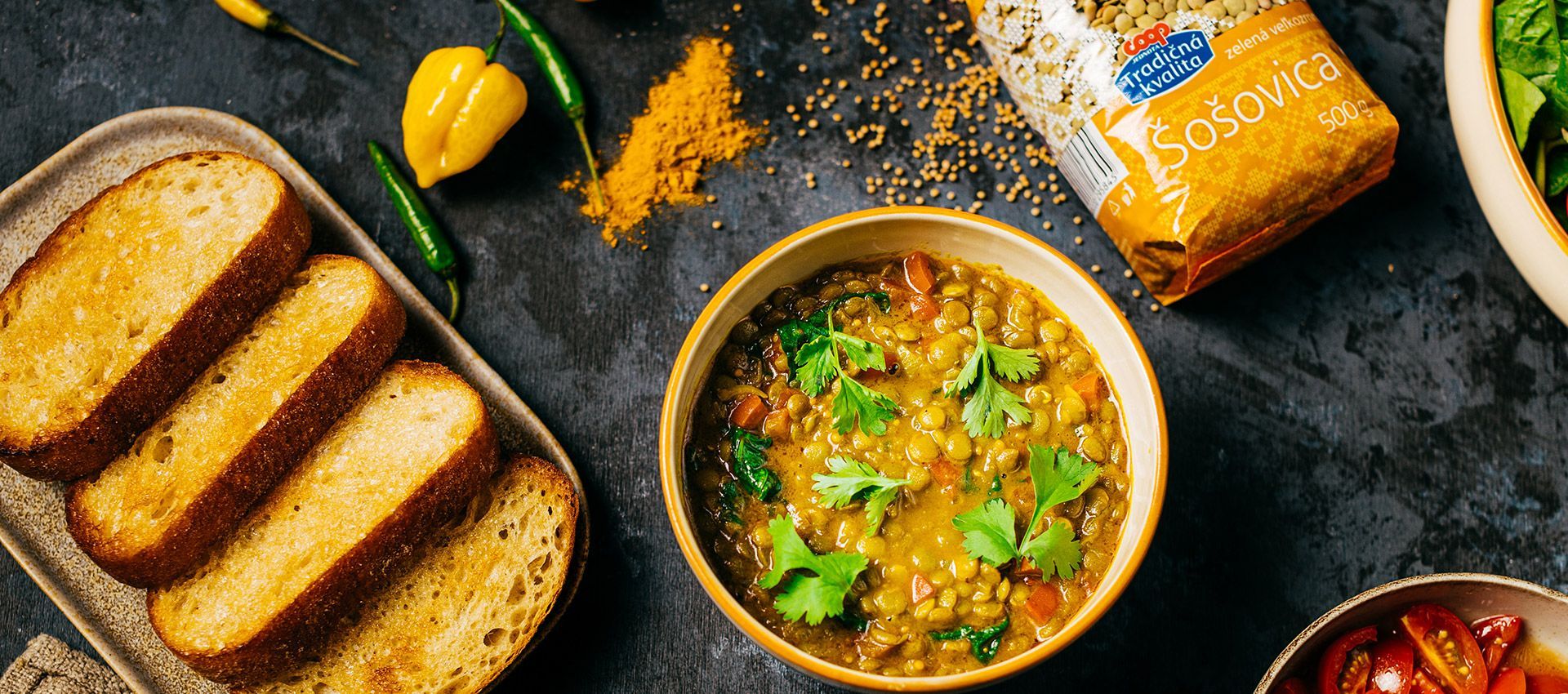 Do mixéra dáme cibuľu, zázvor, cesnak, chili papričku, papriku, koriander, soľ a čierne korenie - všetko spolu rozmixujeme najemno. Do kastróla dáme lyžičku oleja, kari, kurkumu, horčicové semiačka a dobre premiešame. Pridáme rozmixovanú zeleninu a povaríme. Pridáme šošovicu, 700 ml vody a kokosové mlieko. Varíme pod pokrievkou a pravidelne miešame.