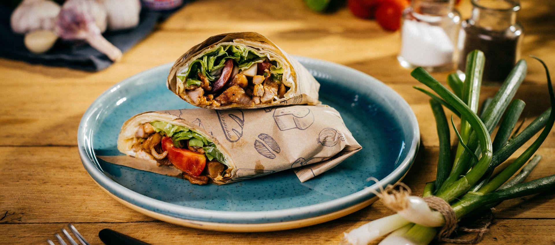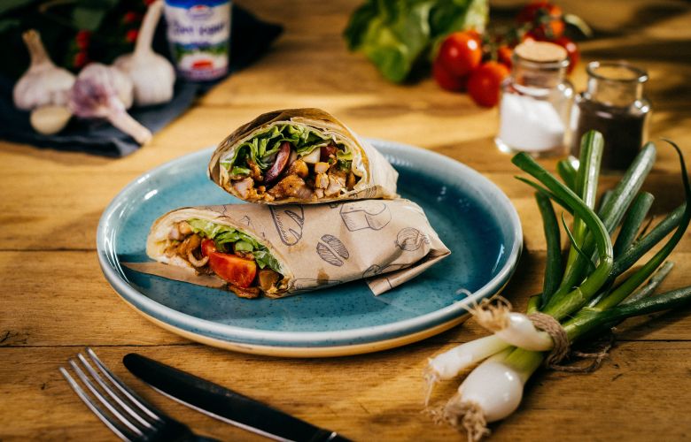 Na rozpálenú panvicu dáme kuracie mäso, pridáme citrónovú šťavu a restujeme do zlatista. Cestá rozvaľkáme na cca 23 cm a pečieme na rozpálenej panvici bez tuku asi 1 minútu z každej strany. Následne každú placku potrieme jogurtom, pridáme šalát, nakrájané paradajky, kuracie mäso a nakrájanú cibuľku. Zrolujeme a podávame.