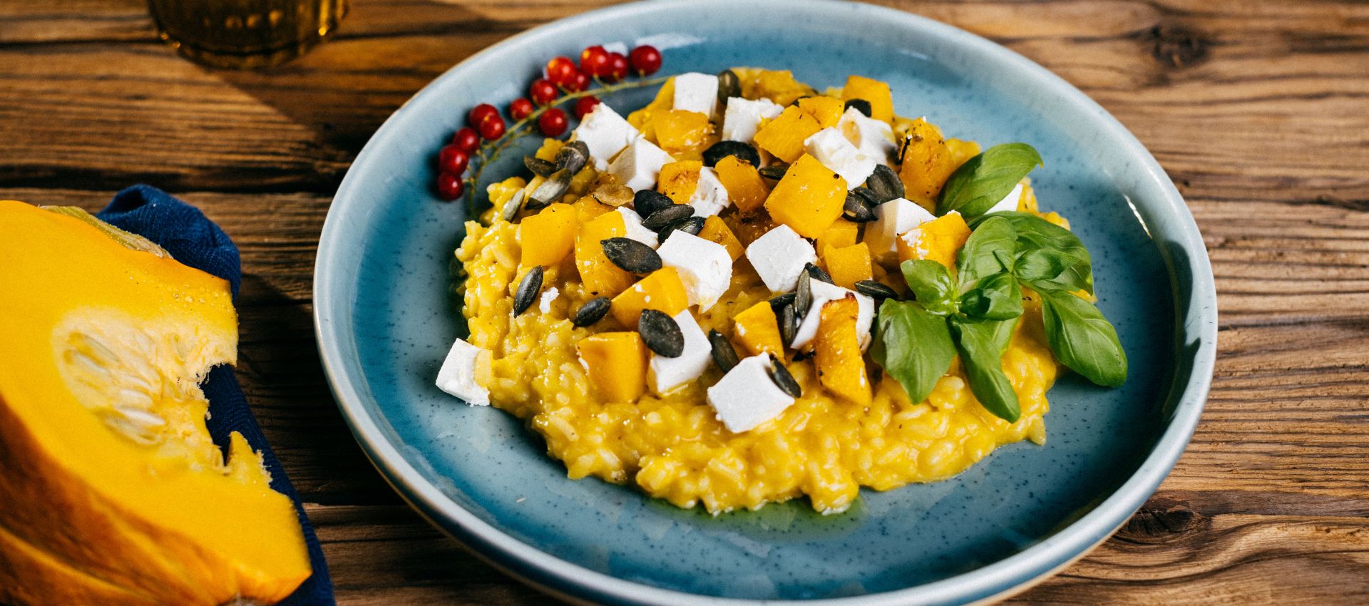 Hotové rizoto posypeme kúskami feta syru a tekvicovými semiačkami.