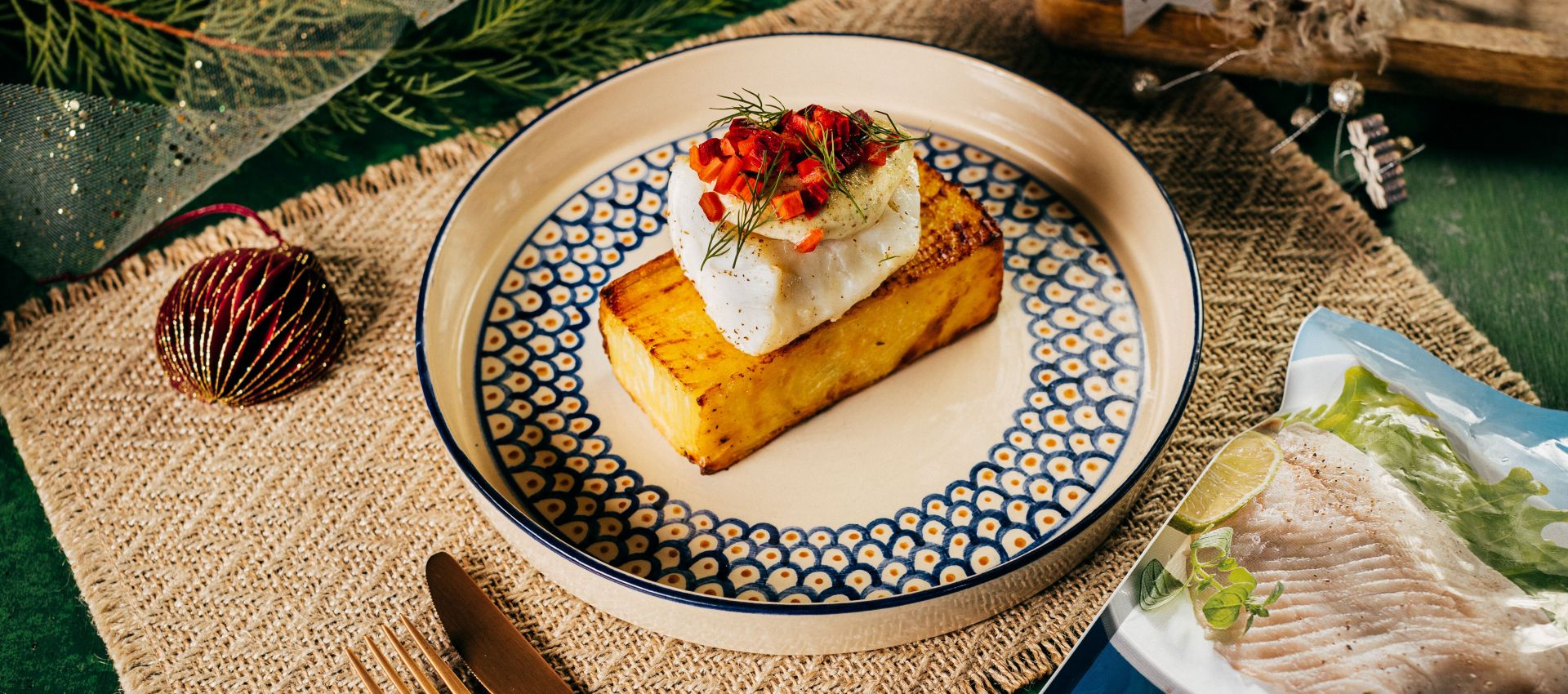 Vykrojený hranol zo zemiakov opečieme v trúbe, tresku uložíme na zemiaky, potrieme majonézou a opálime horákom. Navrch poukladáme nakladanú mrkvu. Dozdobíme kôprom.