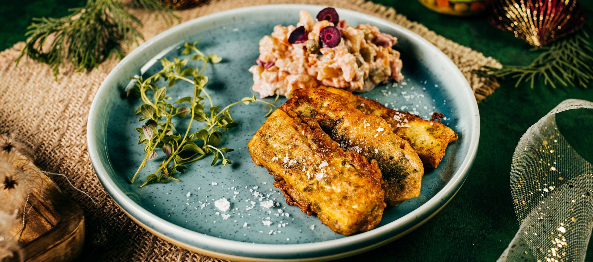 Obalené kúsky vysmážame na rozpálenom oleji. Servírujeme ho s vianočným šalátom: