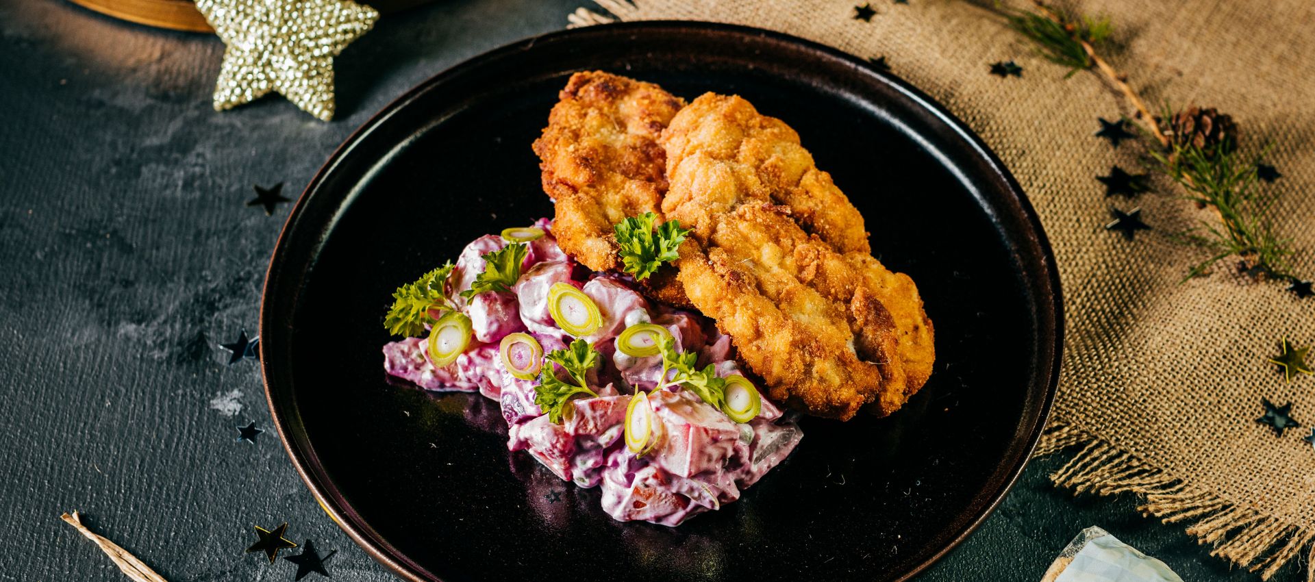 Zemiaky uvaríme v šupke. Necháme vychladnúť. Nakrájame na stredné kocky. Mrkvu uvaríme a ihneď vložíme do studenej vody, nakrájame na kocky. Hrášok rozmrazíme. Cviklu nakrájame. Jarnú cibuľku nakrájame na tenké kolieska. Všetko spolu zmiešame s majonézou a kyslou smotanou. Dochutíme soľou a korením.