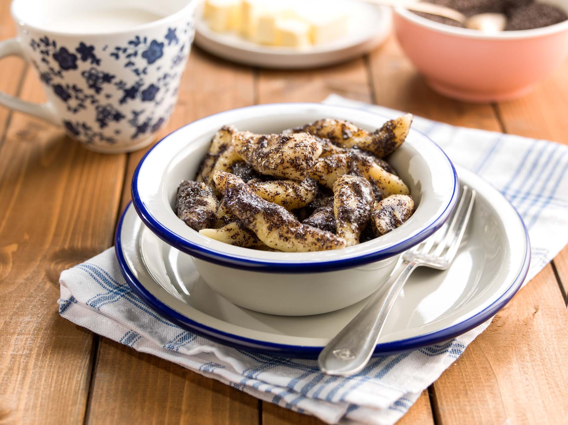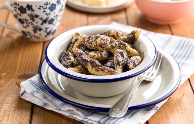 Keď sú uvarené, scedíme ich do misky a ešte do teplých šúľancov pridáme rozpustené maslo, 3 PL kryštálového cukru a mletý mak.