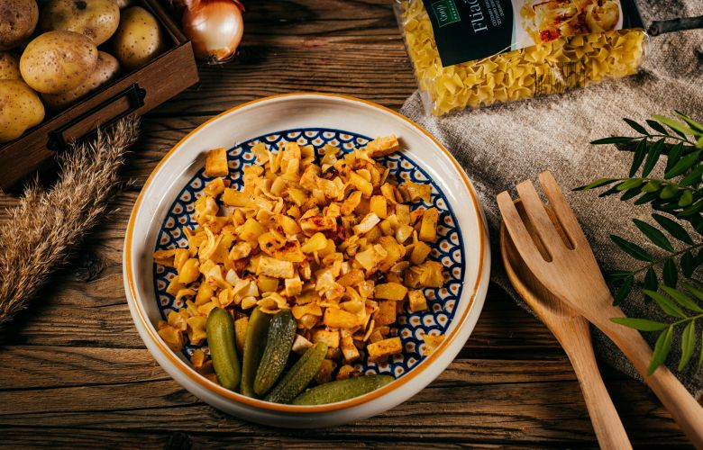 Uvarené zemiaky v šupke očistíme a nakrájame. Podľa návodu uvaríme cestoviny. Na oleji speníme cibuľku, po chvíľke pridáme nakrájané tofu a opekáme ho. Pridáme zemiaky, červenú papriku, soľ, korenie a premiešame. Pridáme cestoviny, ktoré spojíme s ostatnými ingredienciami. Ochutnáme a prípadne dochutíme. Podávame s uhorkami.