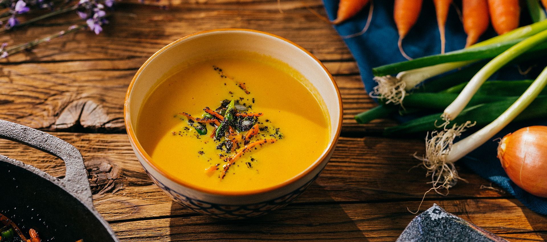 Podávame v miskách a na vrch dáme opraženú mrkvu, cibuľku a mak.