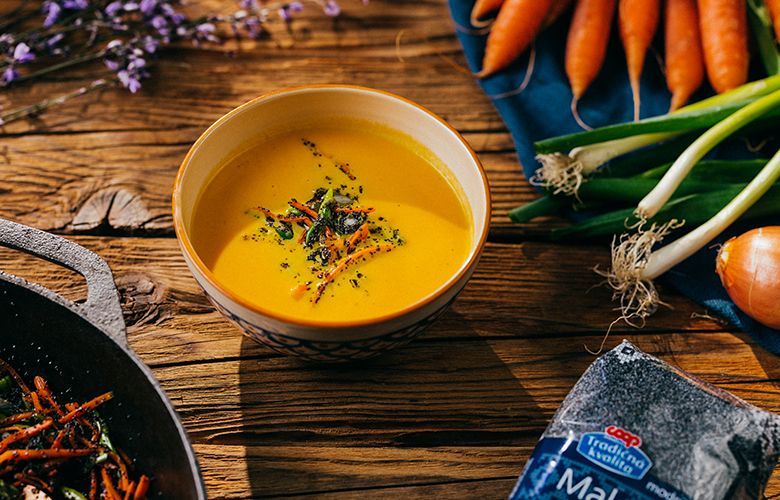 Medzitým na panvicu dáme olej, pridáme cibuľku mrkvu na pásiky a mak. Restujeme cca 1 minútu. Uvarenú mrvu vo vývare rozmixujeme na jemno. Pridáme smotanu a prehrejeme, dochutíme soľou a korením.