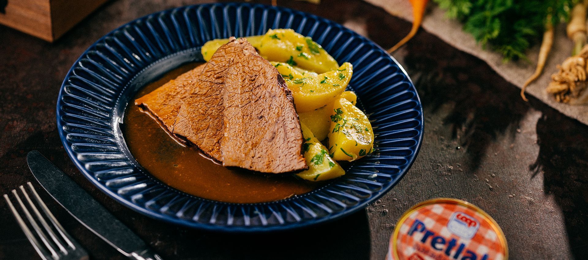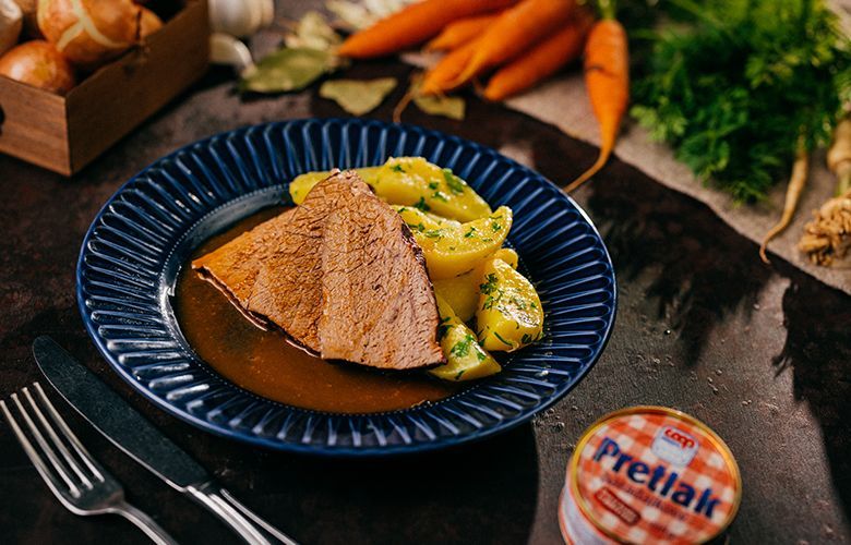 Slaninu pokrájame na menšie kocky a vytopíme v hrnci. Pridáme hovädzie v celku a opečieme do tmava. Opečené mäso vyberieme, pridáme koreňovú zeleninu, nakrájanú cibuľu a pretlačený cesnak. Všetko spolu restujeme, pridáme pretlak a bobkový list. Krátko restujeme a za stáleho miešania postupne podlievame vínom až do vyparenia. Zalejeme vodou alebo vývarom, pridáme mäso a varíme do mäkka. Keď je mäso uvarené, vyberieme ho spolu s bobkovým listom a korením. Šťavu rozmixujeme, scedíme a dochutíme soľou a cukrom.