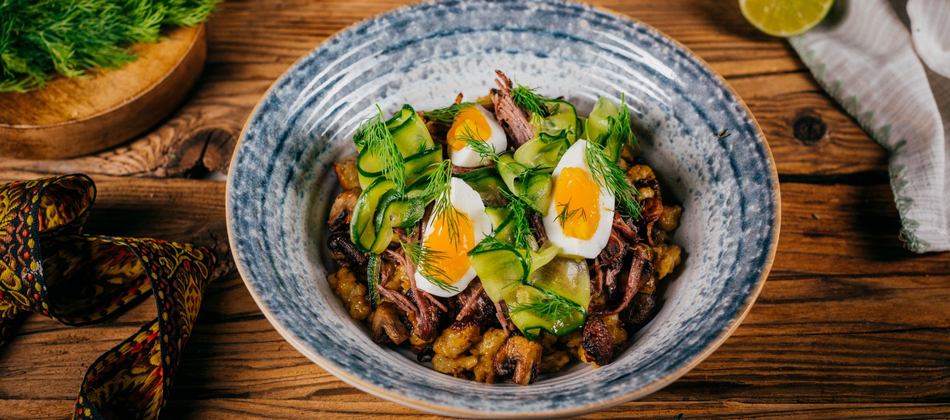 Halušky prehrejeme na panvici s výpekom z mäsa, nakoniec pridáme maslo. Vylejeme na tanier, poukladáme natrhané mäso, prekrojené vajce, šampiňóny a nakoniec uhorky a kôpor.