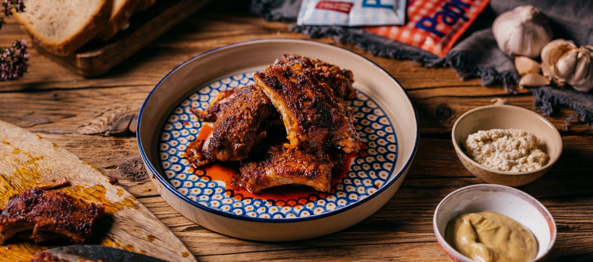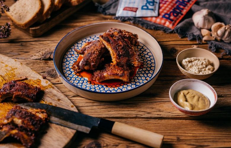 V miske zmiešame sladkú papriku a kajenskú papriku, oregano, soľ a mleté čierne korenie. Prilejeme olej a pridáme očistený a prelisovaný cesnak. Marinádou potrieme rebierka, aby boli obalené.