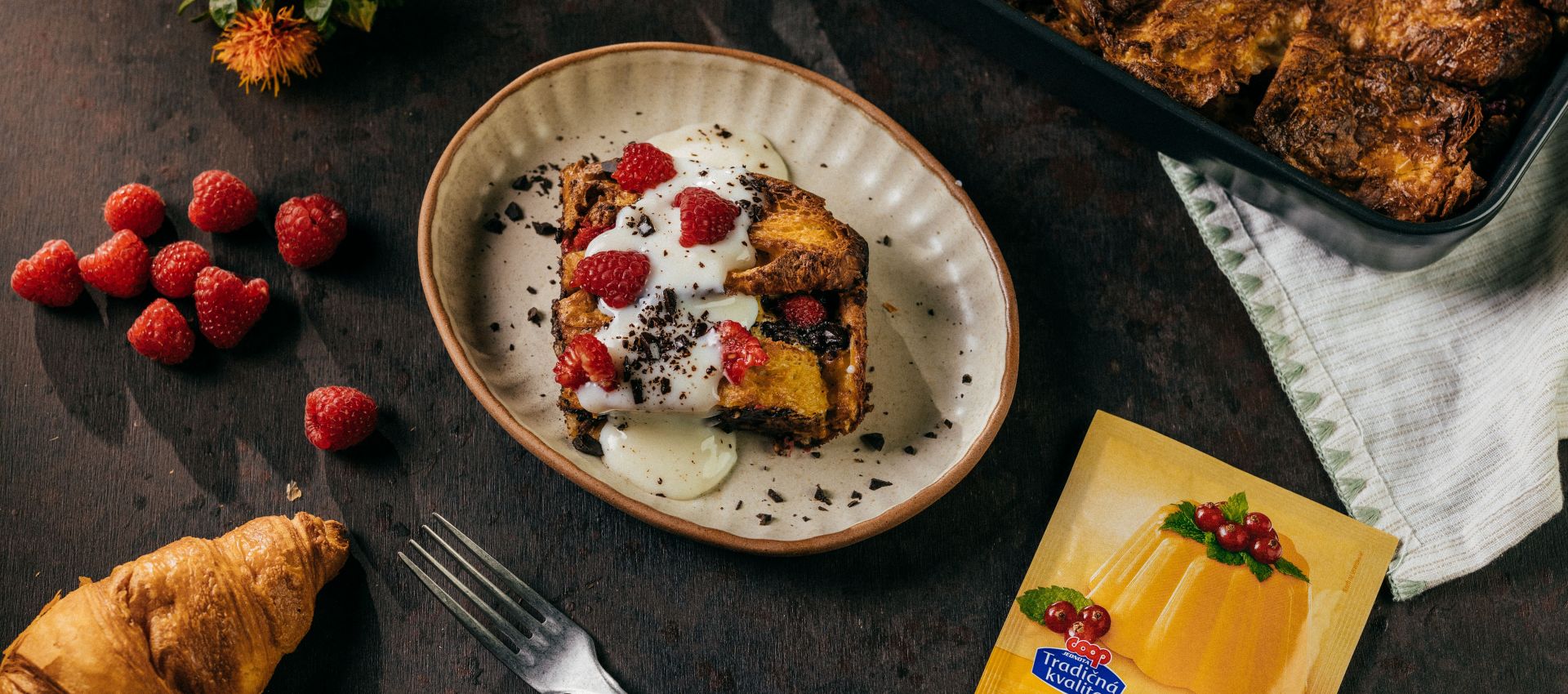 Croissanty si rozrežeme pozdĺžne a namočíme vo vaječnej zmesi. Uložíme do vymastenej zapekacej misy. Každý croissant posypeme čokoládou a malinami. Takto vrstvíme až po okraj zapekacej misky. Na záver vylejeme zbytok vaječnej zmesi na croissanty.
