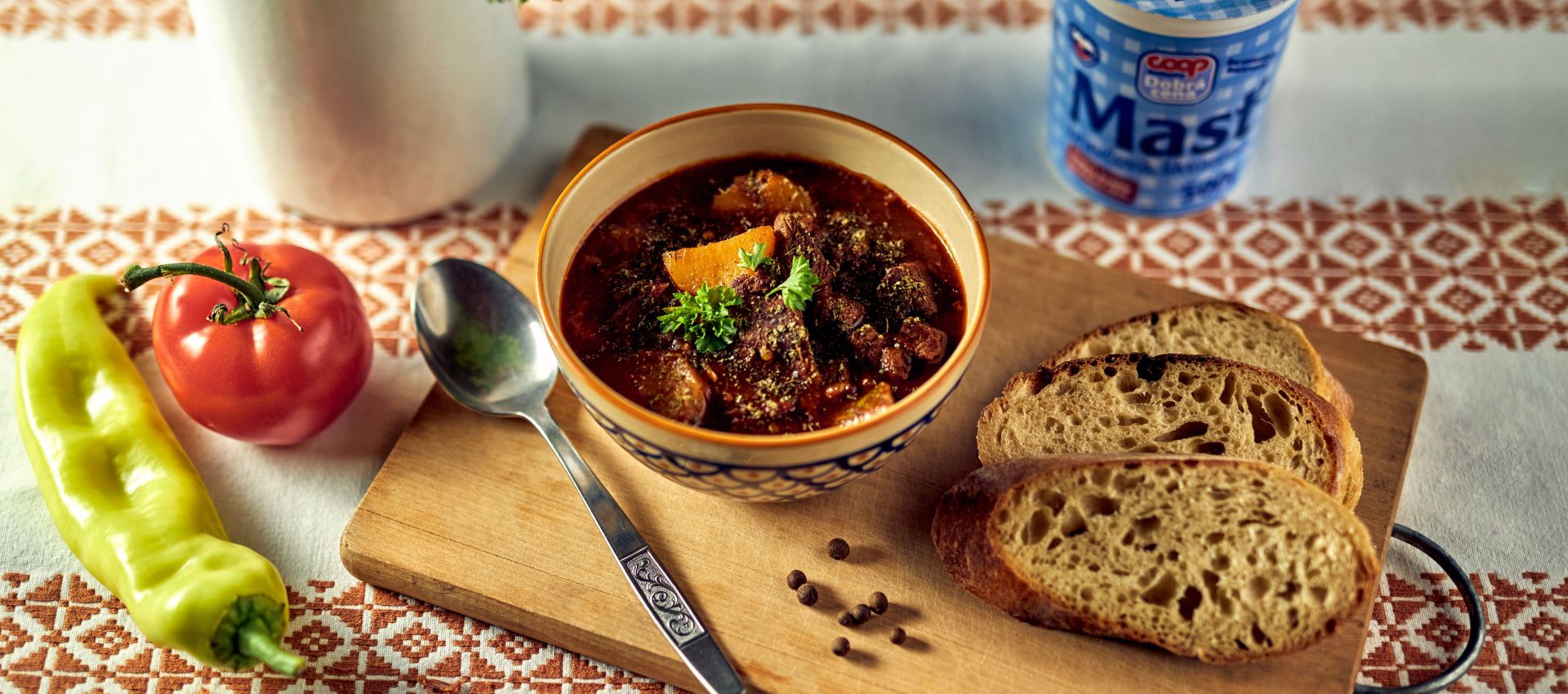 Cibuľu očistíme, nakrájame a restujeme do tmava. Pridáme slaninu nakrájanú na kocky, pridáme mäso nakrájané na väčšie kocky.