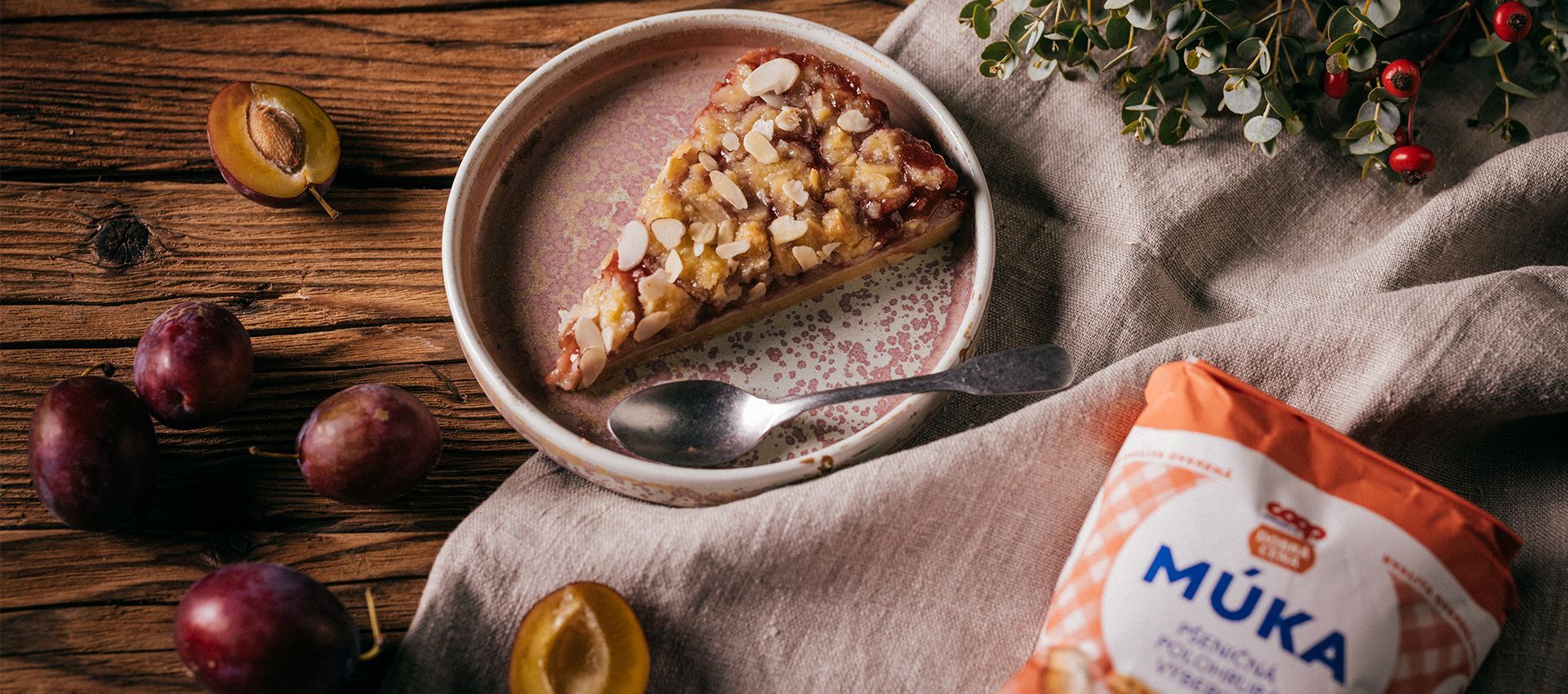Slivky dáme variť vo vode, privedieme k varu. Pridáme cukor a vanilkovú pastu. Varíme 30 minút, kým sa slivky nerozpadnú. Zmes rozmixujeme a varíme ďalej, pokým nevznikne hustý džem. Džem zmiešame so škoricou a rozotrieme na upečený korpus. Posypeme mrveničkou a vložíme na 20 minút na 165 °C.