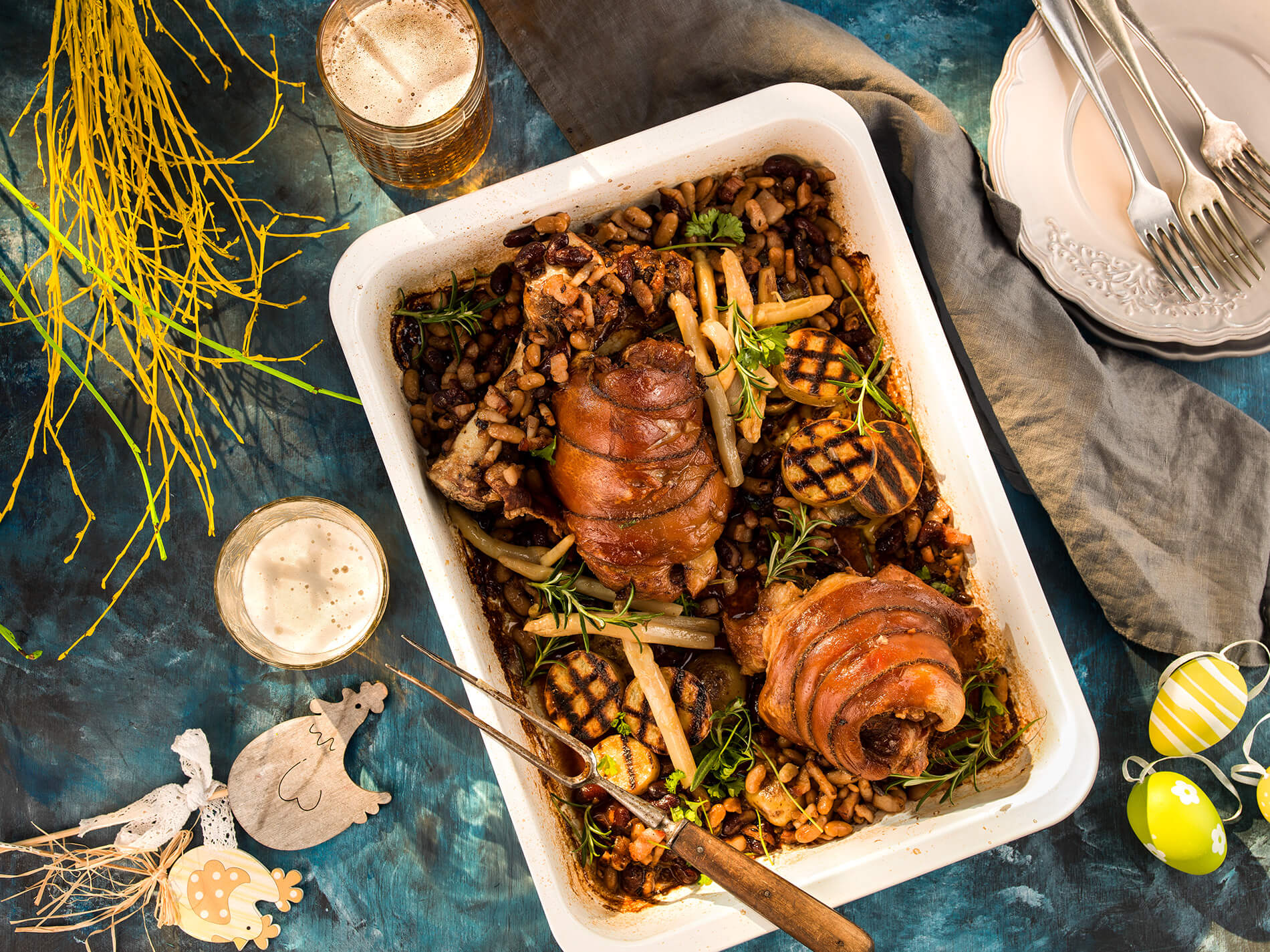 Hotové mäso podávame s pripravenou fazuľovou prílohou a grilovanými zemiakmi.