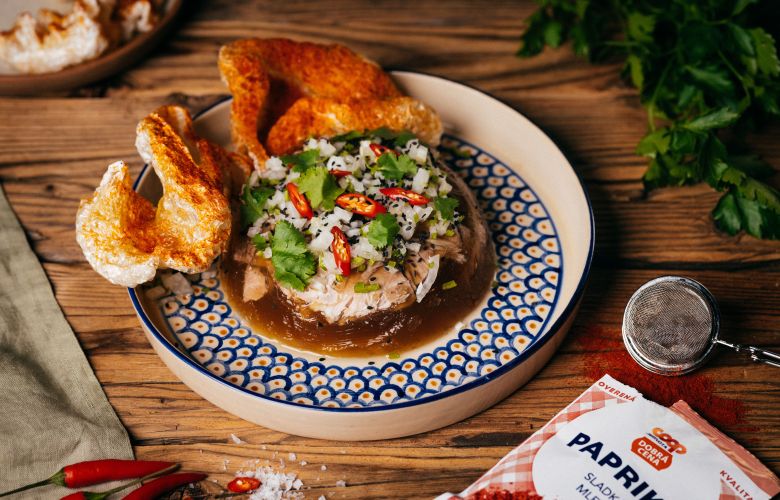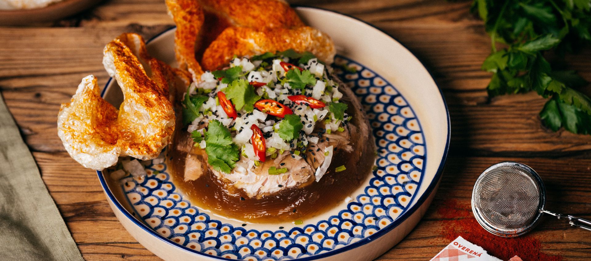 Pri servírovaní môžeme huspeninu vyklopiť na tanier a následne na vrch nasypať na jemno nakrájanú cibuľu s koriandrom, na jemno nakrájať čili, sezamové semiačka, lístky koriandru a jemne preliať ryžovým octom kvôli kyslosti.