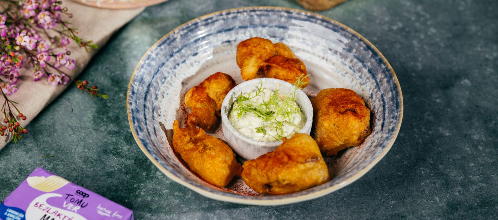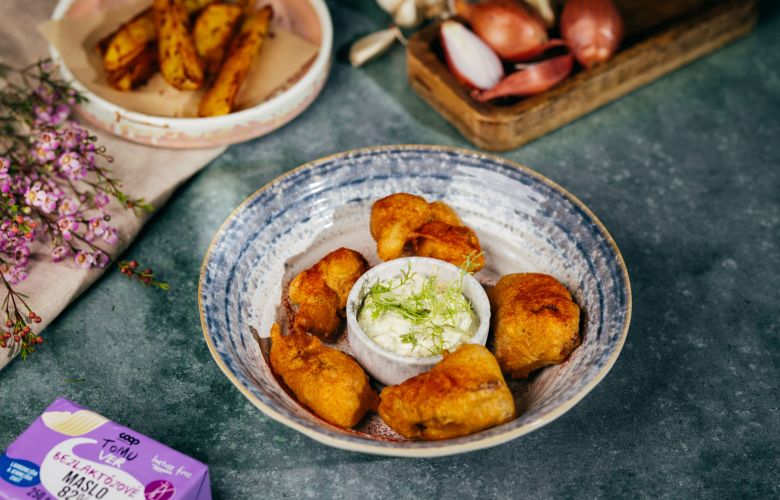 Zemiaky ošúpeme a nakrájame na mesiačiky, ochutíme soľou, korením, rascou a červenou údenou paprikou, následne pokvapkáme olejom a premiešame. Dáme piecť na 160 – 170 stupňov do mäkka. Cesnak si pripravíme vopred konfitovaním – t. j. do oleja alebo roztopenej masti vložíme olúpané strúčiky a pečieme pomaly v rúre na 100 stupňov cca 2 hodiny do zlatista a mäkka. Domácu tatársku omáčku si pripravíme zmiešaním nadrobno nakrájanej šalotky, kyslých uhoriek, konfitovaného cesnaku a kapár so smotanou, majonézou a horčicou. Dochutíme v prípade potreby soľou, korením alebo vodou z uhoriek. Cesto na smaženie pečienok pripravíme zmiešaním múky, droždia, piva a cukru, necháme chvíľu odpočívať a následne dochutíme soľou a korením. Pečienky si očistíme od prípadných blán, nakrájame na menšie kúsky, obalíme jemne v múke a následne v cestíčku, necháme odkvapkať na mriežke a vysmážame v oleji vyhriatom na 180 stupňov.