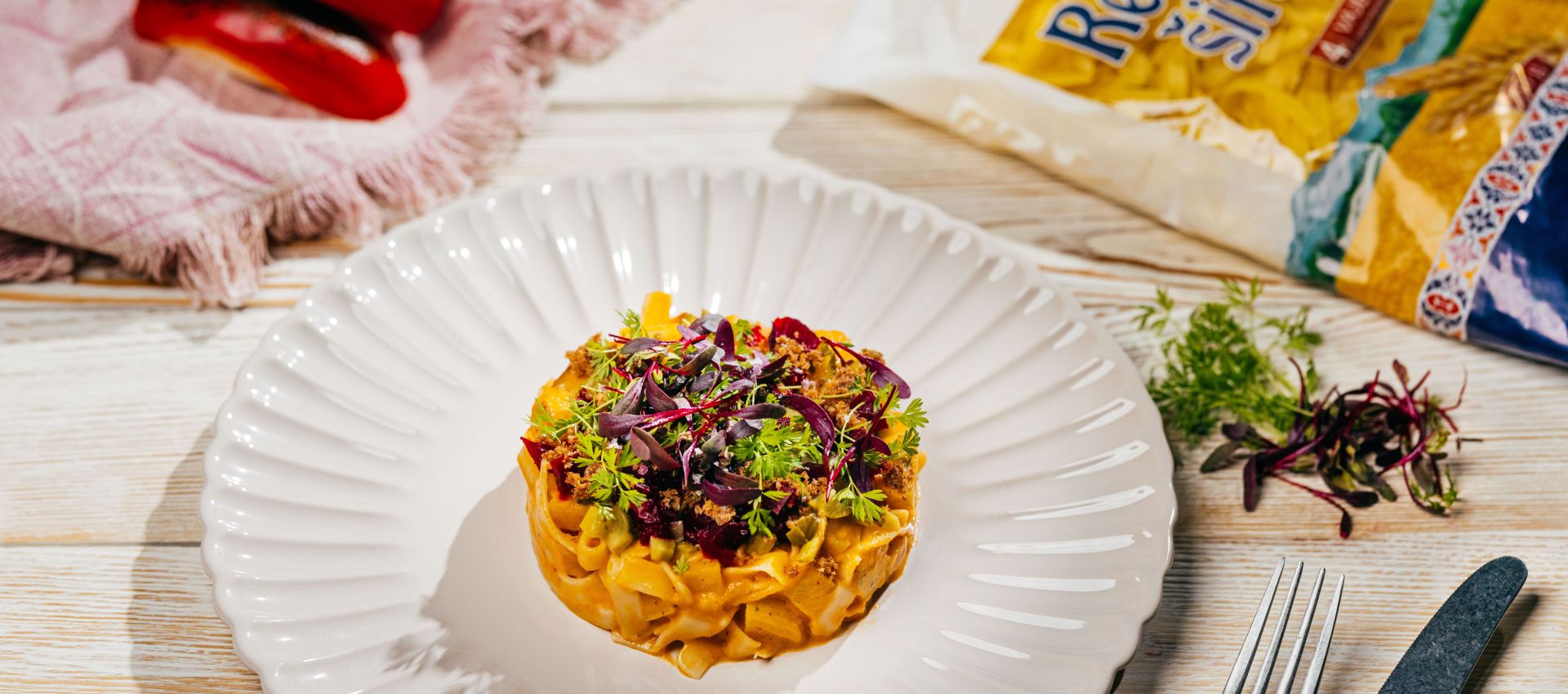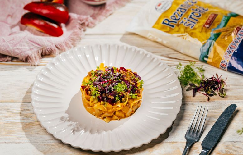 Zemiaky si ošúpeme a nakrájame na menšie kocky, pokvapkáme olejom, osolíme, okoreníme a pečieme vo vyhriatej rúre na 170 °C cca 20 minút. Cestoviny uvaríme vo vriacej a osolenej vode do „al dente“. Na oleji si speníme cibuľku, pridáme cesnak a ošúpané spálené kapie (tie spálime v rúre na 220 °C alebo plameňom až do čierna a následne zaparíme a ošúpeme). Zalejeme vývarom, prípadne aj trochou vody z cestovín a varíme približne 10 minút. Potom celú zmes rozmixujeme na hladkú omáčku, ak bude veľmi riedka, necháme ešte prebublať na sporáku, aby sa zredukovala a dochutíme soľou a korením. Slaninu si na sucho opečieme do chrumkava a necháme vychladnúť. Takto pripravenú slaninu rozmixujeme na prach. V miske si zmiešame cestoviny, zemiaky a omáčku. Servírujeme spolu s nakrájanými uhorkami a cviklou, slaninovým prachom a bylinkami.