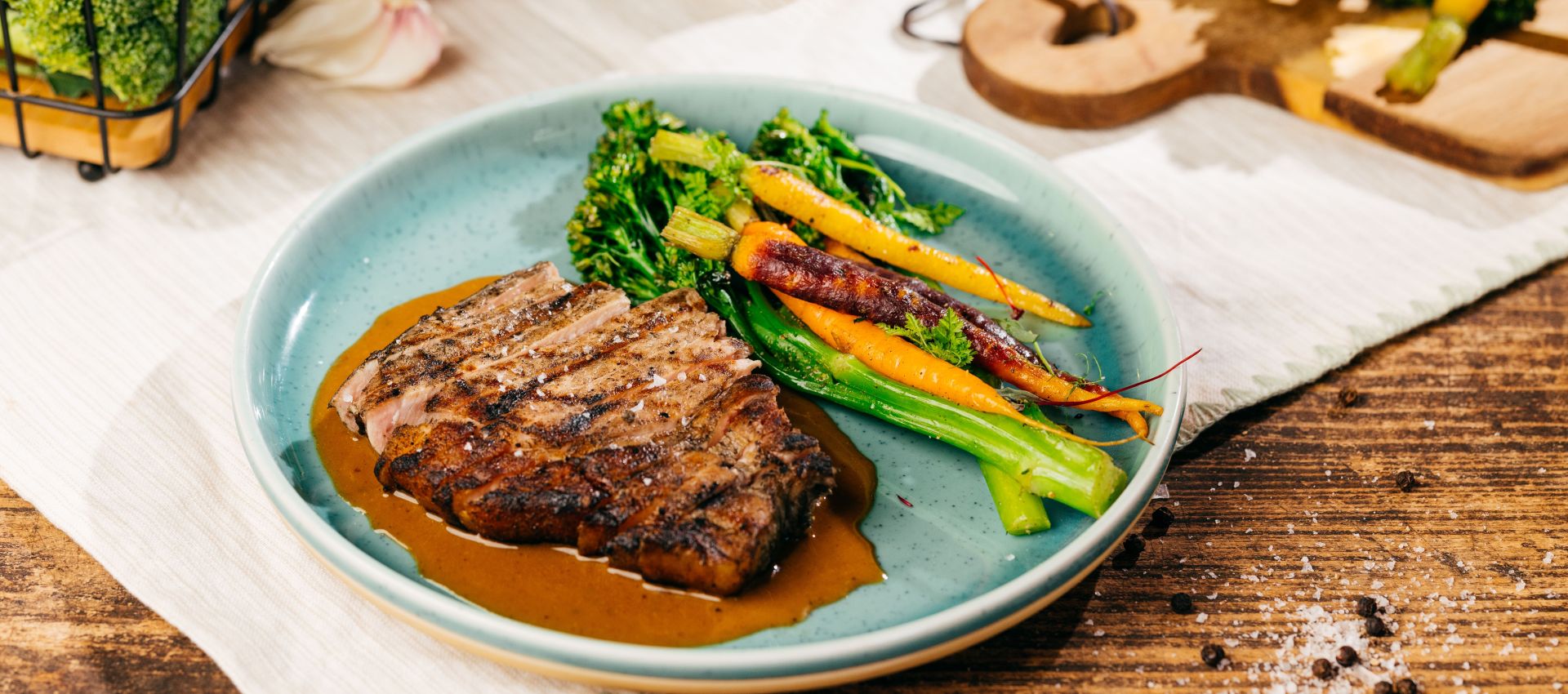 Brokolicu a mrkvu si očistíme, dáme zovrieť vodu, ktorú následne osolíme. Vložíme zeleninu na približne 3 minúty, potom šokovo schladíme v ľadovej vode. Takto pripravenú zeleninu pokvapkáme olivovým olejom, posypeme grilovacou zmesou a pár sekúnd sprudka ugrilujeme, aby zostala chrumkavá.