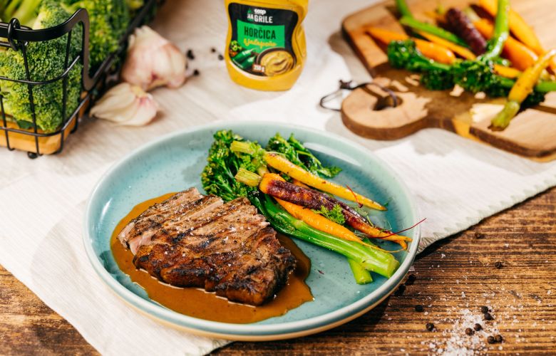 V malom hrnci na miernom plameni prehrejeme demi glace, primiešame horčicu s jalapeño, odstavíme a zašľaháme studené maslo - vznikne nám krémová omáčka.