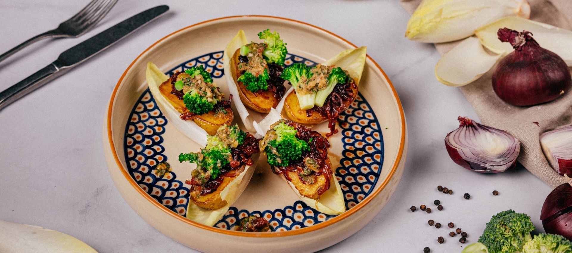 Na dresing pokrájame olivy, sušené paradajky, kapary a petržlenovú vňať. Sardelu a cesnak najemno nasekáme. Všetko spolu zmiešame, ochutíme soľou, korením, cukrom, citrónovou šťavou a olejom. Cibuľu očistíme a nakrájame na hrubšie pásiky. Zo zvyšného cukru spravíme v hrnci svetlý karamel. Vmiešame balzamikový ocot, pridáme cibuľu a všetko spolu podusíme . Zemiaky dáme variť v šupke do vriacej vody. Po uvarení zlejeme, necháme vychladnúť a nakrájame pozdĺžne. Vo veľkej panvici rozohrejeme olej, vložíme zemiaky šupkou nahor a opečieme do zlatista. Brokolicu rozoberieme na ružičky a uvaríme vo vriacej vode. Čakanku rozoberieme na jednotlivé listy a dáme na tanier. Zemiaky na panvici osolíme, okoreníme a pridáme k čakanke. Pridáme brokolicu a karamelizovanú cibuľu a pokvapkáme dresingom.