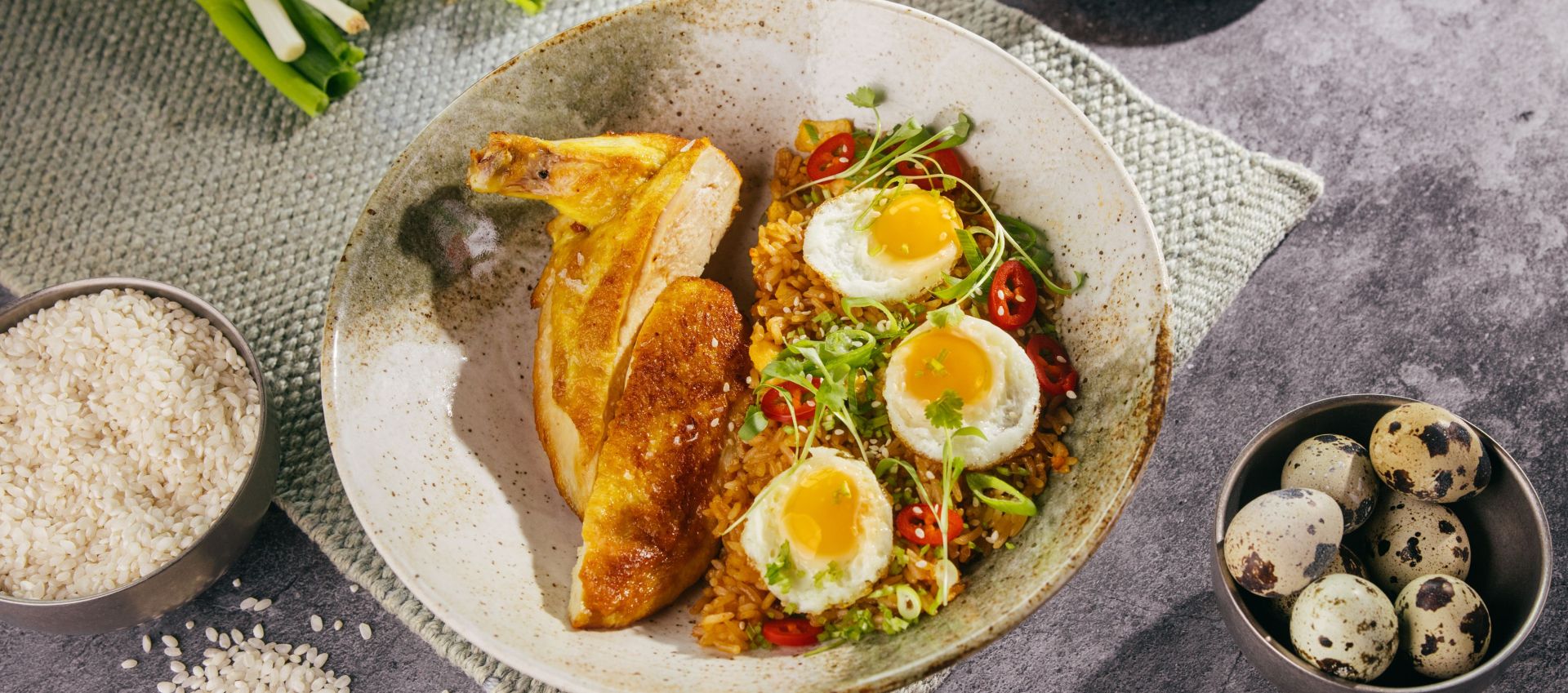 Ideálne pri tomto recepte je použiť staršiu ryžu z predošlého dňa, ale môžeme uvariť aj čerstvú a nechať ju na vzduchu vychladnúť a obschnúť. Do rozpálenej panvice si dáme trochu oleja, vyšľaháme si vajíčka a sprudka ich opečieme a „rozhádžeme“ varechou. Dáme si ich bokom. Do panvice opäť pridáme trochu oleja, orestujeme na jemno nakrájanú červenú cibuľu, postupne pridávame nasekanú jarnú cibuľku, zázvor a cesnak. Po chvíľke, keď nám zázvor krásne rozvonia, pridáme pálivú paprikovú pochúťku a poriadne premiešame. Pridáme ryžu a opäť poriadne premiešame. V tejto chvíli pridáme pripravené omáčky, zamiešame a ochutnávame. V prípade potreby ešte pridáme sójovú omáčku alebo pálivú paprikovú pochúťku, ak bude jedlo málo pikantné. Na záver pridáme opečené vajíčka a opäť premiešame. Na druhej panvici si upečieme kuracie prsia, ktoré následne necháme 3 minúty oddýchnuť na doske. Zatiaľ si upečieme z maličkých prepeličích vajíčok volské oká. Servírujeme spoločne ryžu, mäso nakrájané na plátky, prepeličie volské oká a koriander s nasekanou jarnou cibuľkou.