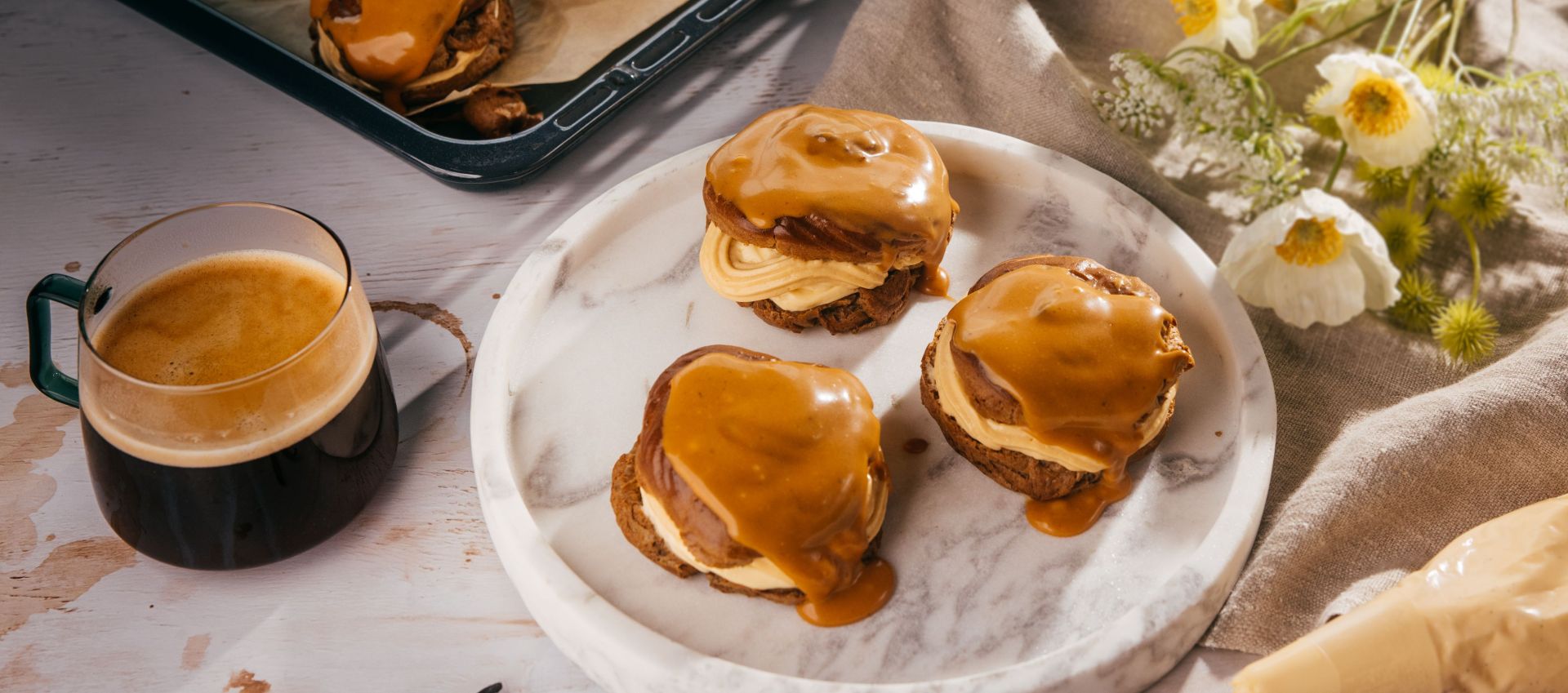 Na odpaľované cesto si do hrnca navážime podľa receptu vodu, mlieko, kávu, soľ, cukor a maslo. Privedieme k varu a následne pridáme múku, začneme poriadne miešať, aby nám zmes neprihorela. Odpaľujeme asi 1 – 2 minúty, aby nám vznikla pekná jednoliata hmota. Tú potom presunieme do kuchynského robota a počas pomalého miešania necháme mierne vychladnúť. Postupne pridávame vajíčka a nechávame zamiesiť. Miesime, až kým zmes nevychladne a zároveň nie je krásne prepojená. Na plech si dáme papier na pečenie a zmes, ktorú sme si pripravili dáme do cukrárskeho vrecka s cukrárskou koncovkou. Na plechu si vytvarujeme krúživým pohybom kolieska a následne dáme piecť na 25 – 30 minút na 195 °C. Dôležité je neotvárať rúru počas pečenia, aby veterníky nespľasli. Po dopečení ich vyberieme a necháme vychladnúť. Na sporák si dáme menší hrniec, do ktorého si nasypeme cukor a necháme pomaly rozpúšťať bez toho, aby sme ho miešali. Mal by sa nám vytvoriť zlatý karamel, dávame pozor, aby nezhorel. Ak už je zlatistý, znížime plameň a pridáme k nemu espresso a následne smotanu. Necháme všetko rozpustiť a prepojiť, vznikne hladký krém. Odstavíme zo sporáka a polovicu karamelu si odoberieme do misky a necháme vychladnúť. Druhú polovicu si dáme do misky s nasekanou bielou čokoládou a mixérom vymixujeme na jemnú emulziu. Necháme vychladnúť.