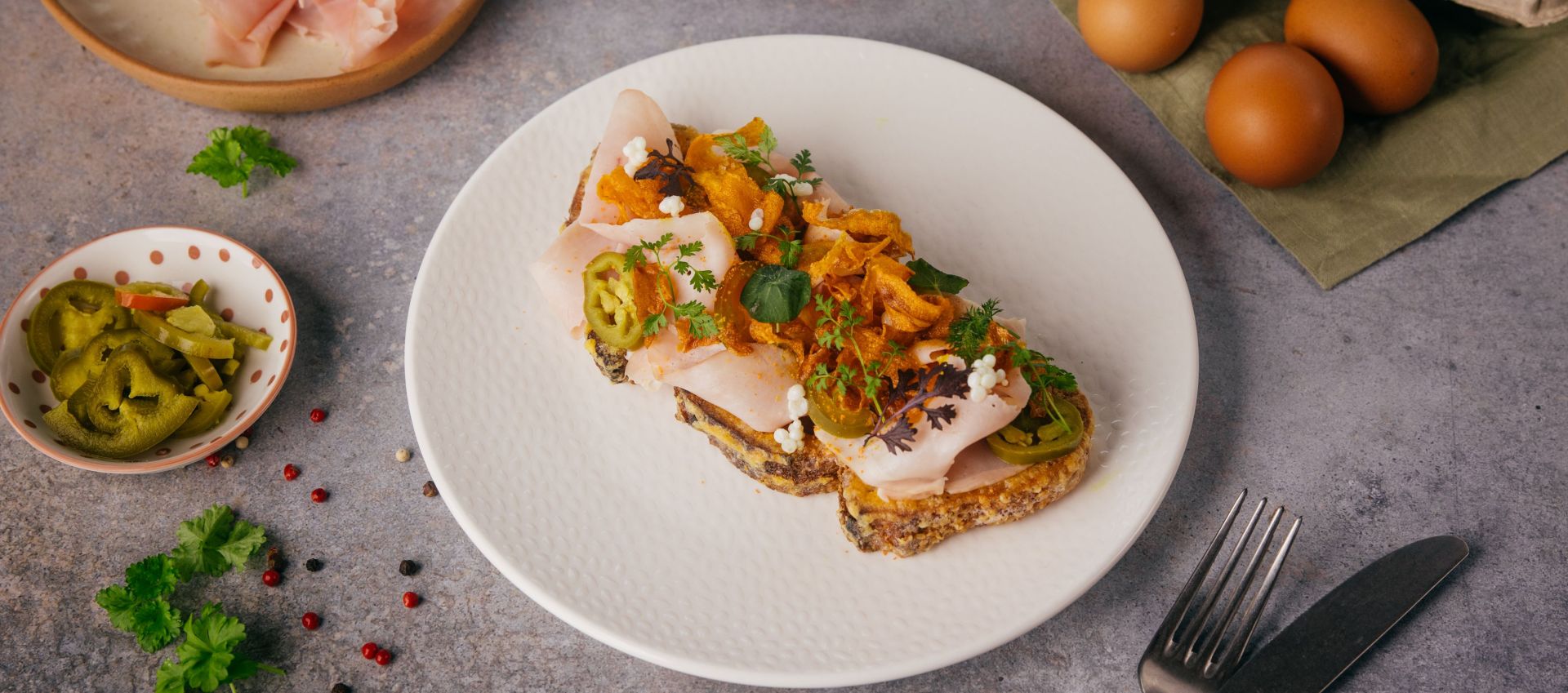 Žĺtky vymiešame s parmezánom a čiernym korením. Krajce chleba poriadne vykúpeme vo vzniknutej zmesi a upečieme na oleji do chrumkava. Na chlebík poukladáme plátky šunky, pridáme majonézu podľa chuti, nakladané jalapeño papričky a chipsy z mrkvy, ktoré si pripravíme tak, že tenké plátky mrkvy vysmažíme v oleji rozohriatom na 180 °C približne 1 – 2 minúty. Ak chceme skúsiť aj zaujímavú fintičku, bielka z vajíčok môžeme nabrať do injekčnej striekačky a kvapkať ich pomaličky do oleja rozohriateho na 70 °C, vznikne nám tzv. vajíčkový kaviár, ktorý tiež pridáme na hotový chlebík. Doladiť môžeme na záver ešte bylinkami.