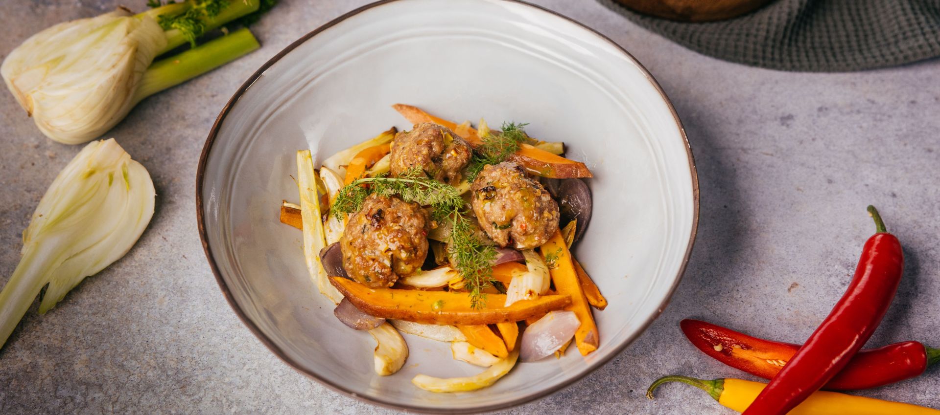 Rozpálime rúru na 200 °C. Bataty nakrájame na dlhé tenké hranolčeky, fenikel rozpolíme, vyrežeme tuhý stred, odrežeme korienok a nakrájame ho pozdĺžne na plátky. Bataty a fenikel premiešajte s olivovým olejom, osolíme a presunieme na stred väčšieho kusu papiera na pečenie. Mleté mäso v mise osolíme, okoreníme, pokvapkáme olejom, pridáme nadrobno nasekanú lahôdkovú cibuľku, štipľavú papričku a nasekaný cesnak. Môžeme prihodiť aj najemno nasekanú pažítku, nastrúhaný parmezán a dôkladne premiešame. Zo zmesi vytvarujeme malé fašírky a pridáme ich na plech k batatom s feniklom. Červené cibule nakrájame na mesiačiky. Prihodíme na plech, pokvapkáme olejom a pečieme v rúre vyhriatej na 200 °C približne 30 minút. V miske si vymiešame omáčka z horčice, medu, citrónovej šťavy a nasekanej vňate feniklu, ochutíme soľou a čiernym korením. Naservírované jedlo jemne prelejeme pripravenou omáčkou.
