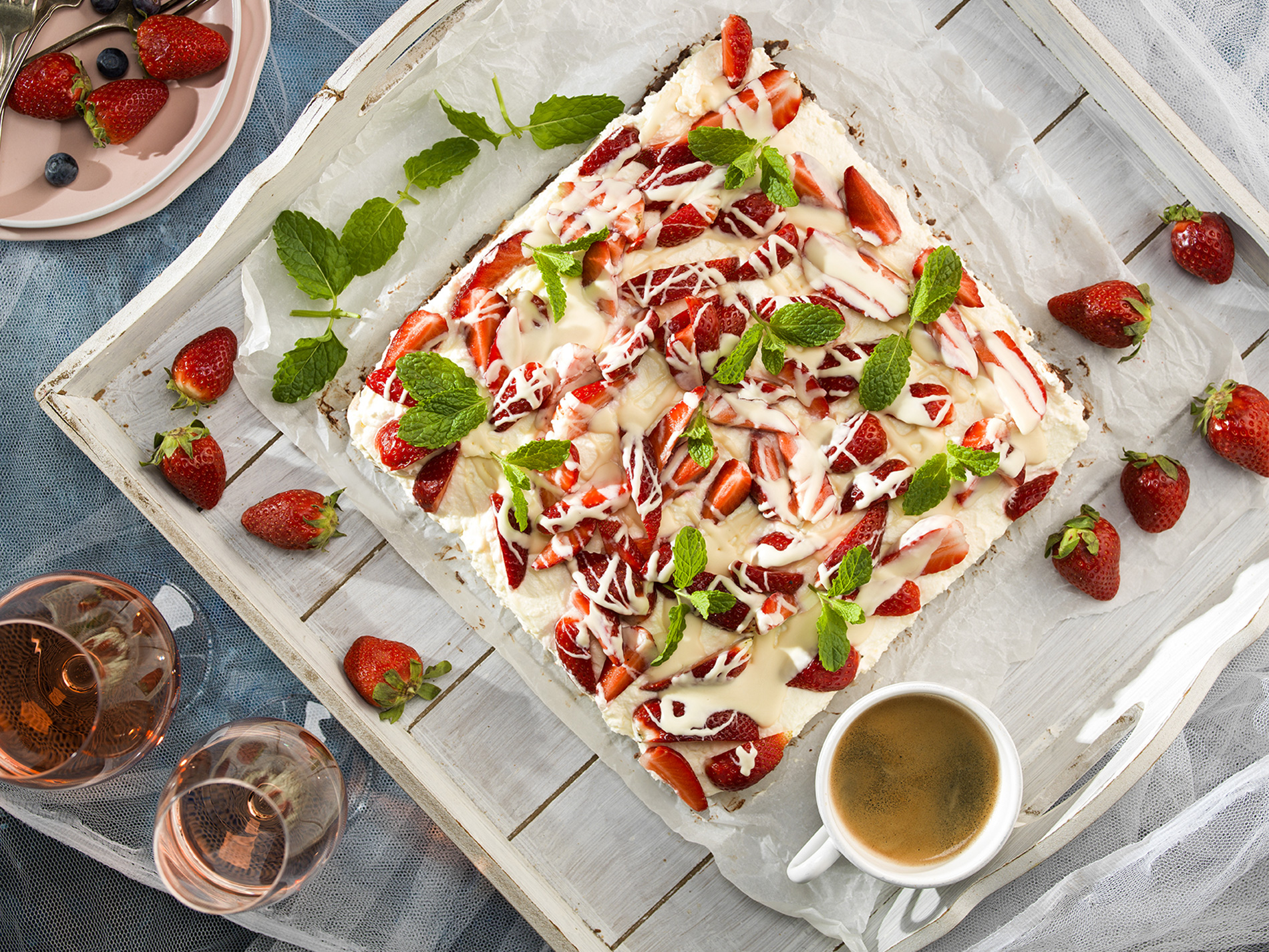 Na druhý deň umyjeme a nakrájame jahody a rozpustíme zvyšnú čokoládu. Oboje rozdelíme navrch dezertu a môžeme servírovať.