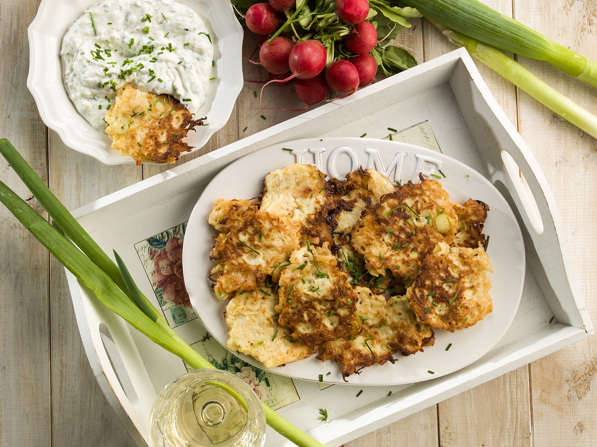 Cibuľky očistíme, umyjeme a nakrájame na kolieska. Odležanú (troška usušenú) reďkovku zmiešame s cibuľkou, strúhankou, škrobovou múčkou, 4 PL jogurtu a s vajcom. Ak je zmes príliš riedka môžeme pridať vajce alebo zahustiť škrobovou múčkou či strúhankou.